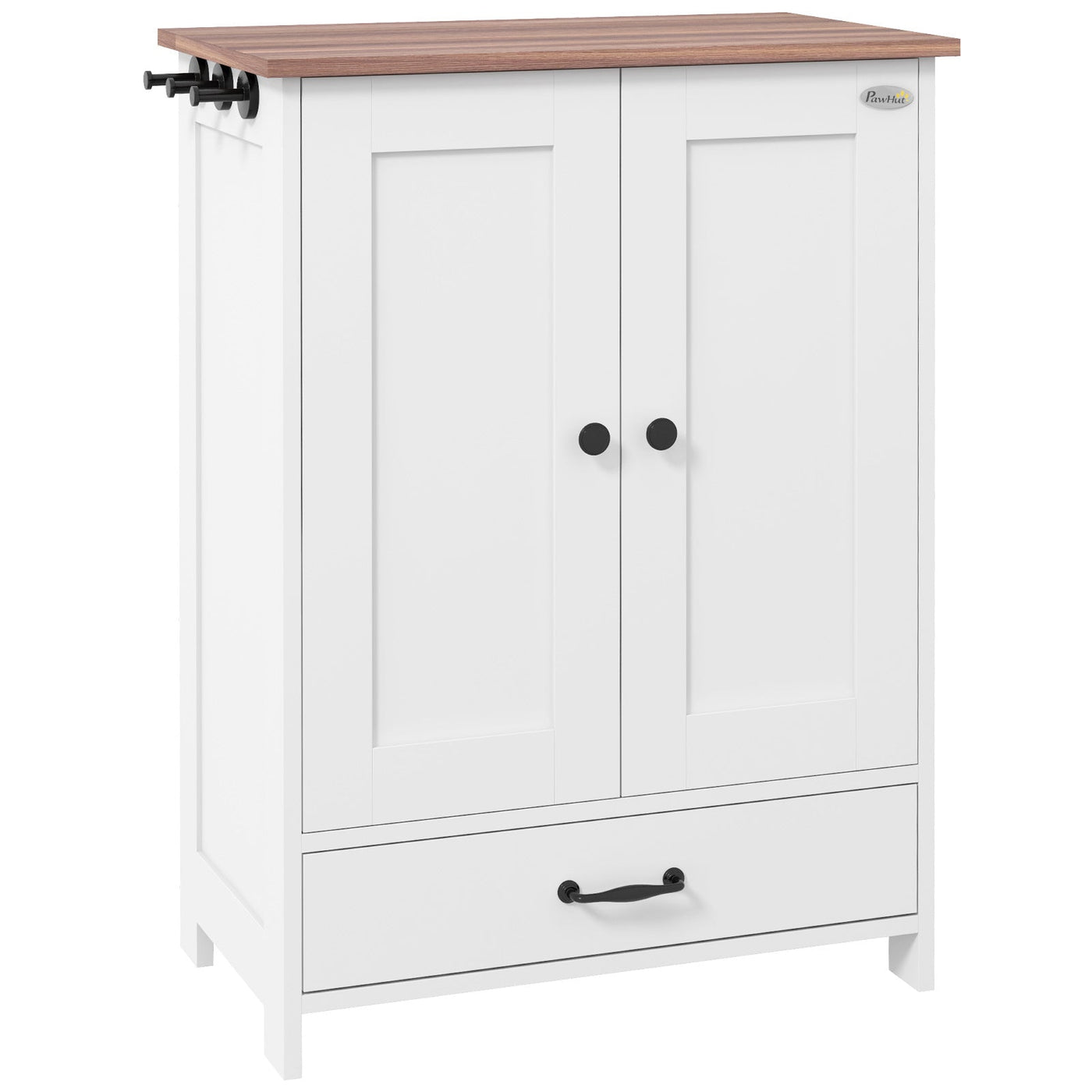 A sleek solution for feeding and storage – this PawHut pet station gives medium dogs a tidy and comfortable space to enjoy meals. Two hidden bowls are built into the cabinet, keeping food and water organised, while the spacious storage area – with a removable panel and adjustable height – holds treats, toys and more. Three side hooks keep leashes and collars within reach, while the large top offers space for displaying pieces. Finished in classic white, it blends seamlessly into any home.