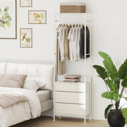 Color: Black + Rustic Brown/Black/White Materials: Metal, Engineered Wood, MDF, Non-woven Fabric, PVC, PP Product Dimension: 55 x 28 x 176 cm (L x W x H) Inner Size of Drawer: 51 x 28 x 18 cm (L x W x H) Distance between Two Holes: 8 cm Weight Capacity of Top Shelf: 10 kg Weight Capacity of Countertop: 20 kg Weight Capacity of Hanging Rod: 5 kg Weight Capacity of Each Drawer: 5 kg Net Weight: 9.5 kg Box Qty:1(May vary by batch) Package Includes: 1 x Clothes Rack 1 x Instruction