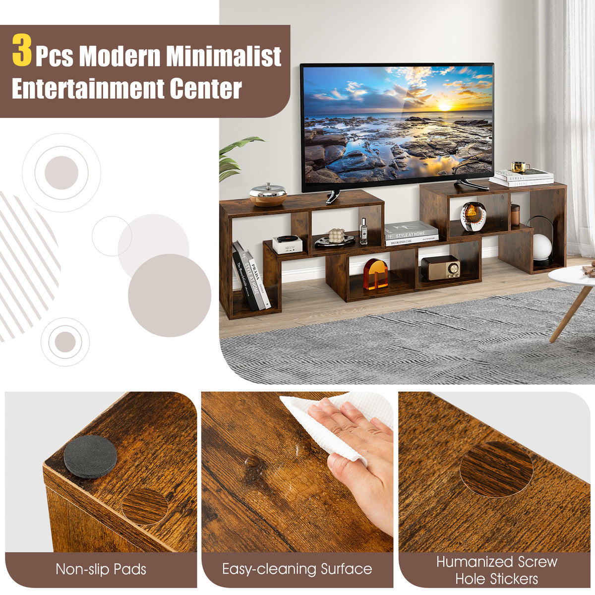 Wanna add extra storage space to keep your home clean and organized? Wanna an elegant TV stand or a console table to match your modern home style? This 3 PCS console TV stand definitely satisfies your needs! It is composed of 2 L-shaped shelves and a rectangular shelf, offering ample space for a television, video player, books, CDs, vases and potted plants. You can combine it freely as you like, making it a TV stand, a bookshelf or an ordinary storage cabinet. Plus, made of premium board, the TV stand can withstand large capacity. And different combination style means different load-bearing capacity. In addition, there are many non-slip pads to enhance stability and steadiness. A simple and stylish appearance adds some character to your home style! You can put it in the living room, bedroom, living room, bedroom, entryway, or hallway. If you are looking for such a product, do not hesitate to buy it! Free Combination: The modern TV console comes in 3 pieces, including 2 L-shaped shelves and a rectangular shelf, which can be combined in multiple ways for different purposes. For example, the 2 L-shaped shelves can be placed on the rectangular one, then be expanded from 134 cm to 180 cm or rotate to form different angles. Plenty of Storage Space: The media entertainment center offers altogether 6 open compartments to help sort out the sundries and prevent clutters. Besides, the extendable tabletop is spacious enough for flat-screen TVs up to 165 cm. And the open design makes it a perfect display shelf/ bookcase for books, ornaments or collections. Sturdy Construction and Non-Slip Pads: Made of 15 mm thickened engineered wood, the wooden TV unit can support a considerable weight and provide a long service life. It is worth mentioning that the load-bearing capacity of the shelf varies with the combination method. What’s more, the 3 pieces of storage shelves are fitted with non-slip pads, which add stability and prevent scratches. Modern Minimalist Style: With sleek lines and a minimalist appearance, the TV stand cabinet breathes a modern flair into your living room. And you can combine the pieces as you like, fully presenting your wild imagination and personal taste. In addition, there are matching stickers to cover the unsightly screw holes for a clean look. Wide Application and Easy Assembly: With the adjustable size and modern appearance, the freely-combined TV shelf can be used as a TV console, a bookcase or a display stand. Furthermore, the setup of the TV console unit is also a breeze, as long as you follow the steps in the assembly instruction.
