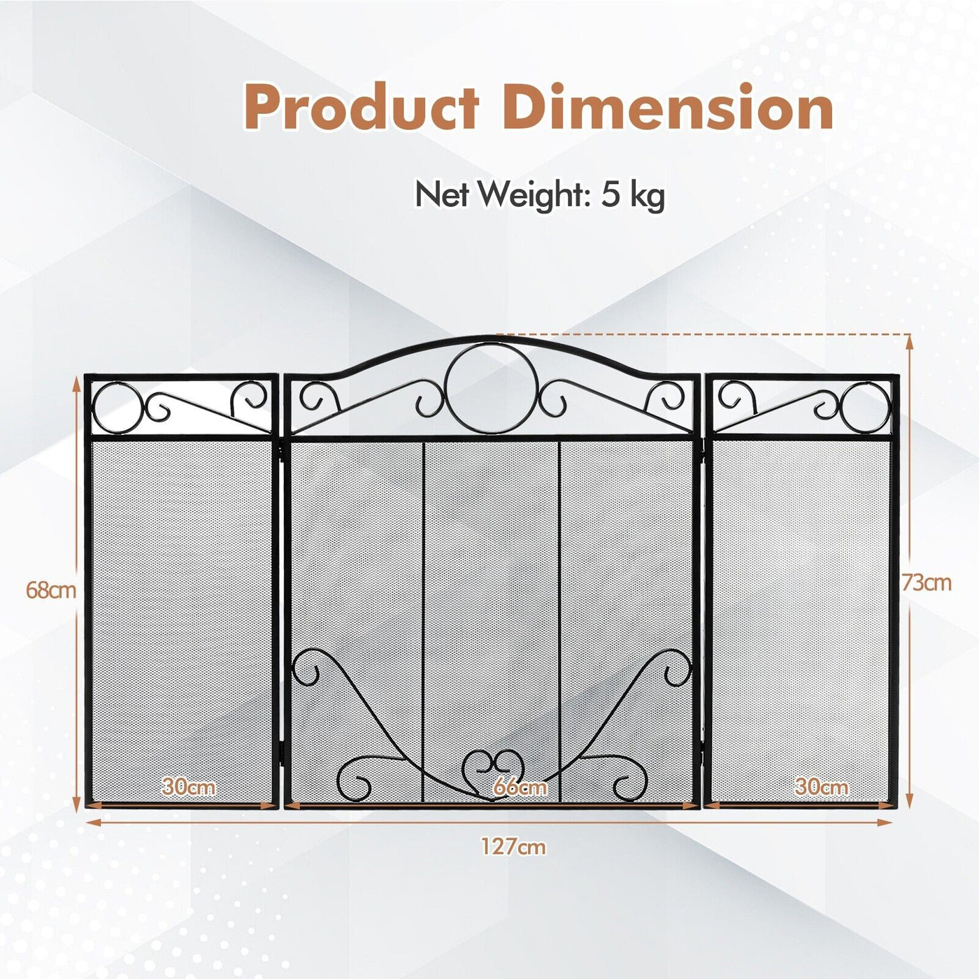 Colour: Black Material: Steel Overall Dimension: 127 x 73.5 x 2 cm (L x W x T) Folding Dimension: 66 x 73.5 x 4 cm (L x W x T) Net Weight: 5 kg Box Qty:1(May vary by batch)Package Includes: 1 x Fireplace Screen