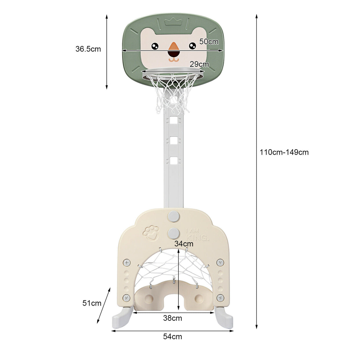 3-in-1 toddler basketball hoop includes golf game, basketball game and soccer goal game. Children can not only play alone but also can play together with their friends, relatives and parents to enjoy the enlightenment of this basketball hoop. In addition, this toddler basketball hoop has 5 heights settings from 78-116 cm, which is suitable for kids in wide age range from 2 to 7. Besides, it is made of non-toxic materials and has a stable triangle structure, which significantly reduce collision damage. To bring your kids enlightenment and fun, this game setwill be a dream gift. 3-in-1 Activity Center: This kids basketball hoop has three sports to play, including golf game, basketball game and soccer goal game. It also comes with 1 basketball,1 soccer ball,2 golf balls and 1 golf club. By playing by themselves or with friends, children can gain unlimited joy and develop motor skills! 5 Adjustable Height Levels: The height of this adjustable basketball stand can be adjusted from 78-116 cm, which ensures that children of all ages can exercise and enjoy the game and makes it suitable for kids in a wide age range from 2 to 7. By rotating the knob on the back, you can get different height ball frames. Stable Triangle Structure: There is a piston on the base of the basketball hoop. After opening it, you can fill water or sand to increase the stability of the base. In addition, a triangular structure base effectively increases the stability of the entire basketball hoop and can prevent children from being injured. Easy Installation and Cleaning Process: In order to facilitate you to quickly obtain a complete basketball hoop, we have reduced unnecessary assembly steps as much as possible. In addition, the dust-proof and smooth surface effectively simplifies cleaning and maintenance steps, helping you save a lot of time and effort. Perfect Gift for Kids: The high-quality and durable HDPE material is non-toxic and tasteless and protects your child's health. Safer to use through ASTM and CPSIA certification. Under the company of the 3-in-1 basketball hoop, toddles are able to develop the skills of hands and legs as well as hand-eye coordination.