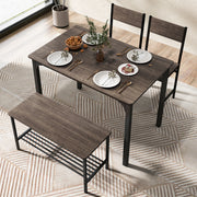 Perfect for intimate dinners or gatherings with friends, this kitchen table set includes a dining table, 2 dining chairs and a bench, offering ample seating for up to 4 people. Crafted with a sturdy metal frame that incorporates reinforced triangle metal, this dining table set is built to withstand the test of time. The set also features anti-slip foot pads, ensuring your floor remains scratch-free. Indulge in ultimate comfort with the stable and comfy chairs' backrests & seats, allowing your guests to enjoy long hours of dining and conversation without fatigue. Need extra storage space? The bench is equipped with an open shelf, ideal for storing sundry items, shoes, blankets, or magazines. For added convenience, the dining chairs and bench can be effortlessly stored beneath the table, freeing up valuable floor space. Easy to assemble with a comprehensive manual, this kitchen table set will infuse your home with a captivating industrial look. Elevate your mealtimes and make lasting memories with this remarkable dining table set! Versatile Table Set: The dining table comes with 2 dining chairs and a bench to provide more seating options, perfect to hold 4 people during intimate dinners or gatherings with friends. Just gather around the dining table set and make every meal special! Strong Metal Frame: Built to last, its solid construction is made of reinforced metal, including added triangle metal for high sturdiness. Also, the dining table set features anti-slip foot pads that will protect the floor from being scratched. Comfortable Sitting: No more discomfort, each dining chair boasts a comfy backrest and a wide seat for optimal comfort. Thus, your guests can enjoy long hours of dining or conversations without feeling tired. More Storage and Space Saver: Its bench includes an open shelf where you can place sundry boxes, shoes, blankets or magazines. Also, when not used, dining chairs and bench can be stored underneath the dining table to free up more floor space. Stylish Look and Easy Setup: Eye-catching design exudes a special industrial style that will refresh your home finishes. Plus, the kitchen table set is equipped with a detailed manual, helping you complete the simple installation.