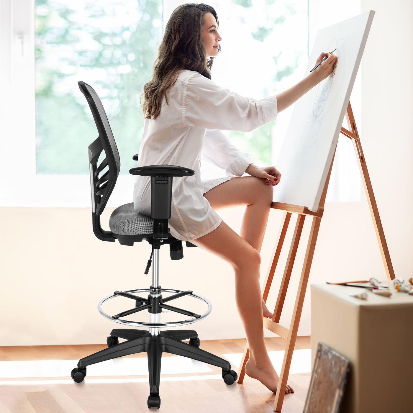 This fantastic comfortable drafting rolling stool chair is designed to bring your workday to new heights! Thanks to the high-class lever, you can quickly adjust the height of this chair to suit a standing desk, normal desk and a high table, which can be used as a drafting chair, bar stool, office chair, and game chair. The footrest and armrests with height adjustment relax your feet or arms in a comfortable position. The ergonomic backrest and lumbar support are combined with the human body curve to prevent physical fatigue during the long working day and achieve the maximum level of comfort. High density and breathable mesh back keep the air flowing for endless enjoyment. Thickened cushion is padded with a high elastic sponge to increase extra comfort. The silent casters and 360°swivel design allow you to enjoy full mobility and flexibility in the office or at home. The sturdy base with a superior class-4 gas lift performs well in sturdiness, safety and durability. Have a comfortable and relaxing working day with this ergonomic mid-back drafting chair. If you are looking for such a product, do not hesitate to take it to your home! Flexible Height Setting and Adjustable Footrest: By lifting a convenient lever under the seat, you can adjust the seat height of mesh drafting chair from 60 to 80cm for your multi-tasking work and tables of different heights. You can also adjust the height of the foot ring and armrests to get a healthy sitting posture. Ergonomic Design for Added Comfort: This mid-back home office chair features a form-fitted ventilated mesh back and built-in lumbar support, which helps you take pressure off your back for all-day comfort. Additionally, an ample sponge-padded contoured seat supports your legs and gives you a feeling of relaxation. High-Density Cushion and Breathable Mesh: Made of high-quality breathable and skin-friendly mesh, the back and seat promote air circulation for a cool experience while working or studying. 10cm thick cushion is filled with a highly resilient sponge to ensure long-lasting service life and provide increased comfort. Heavy Duty Base and Premium Gas Lift: Ultra-sturdy 5-claw base of the swivel desk chair is strong and durable enough to withstand a maximum load of 120kg and prolong longevity. Besides, the SGS-tested certified class-4 gas lift offers additional security and protection for you and your family. 360° Swivel Design and Wide Application: Flexible casters guarantee gliding over the different surface for easy mobility without scratches. Besides, it is more convenient for you to discuss with your teammates due to the 360°swivel design. The combination of chic style and exceptional functionality makes this executive task chair suitable for working, studying and drafting.