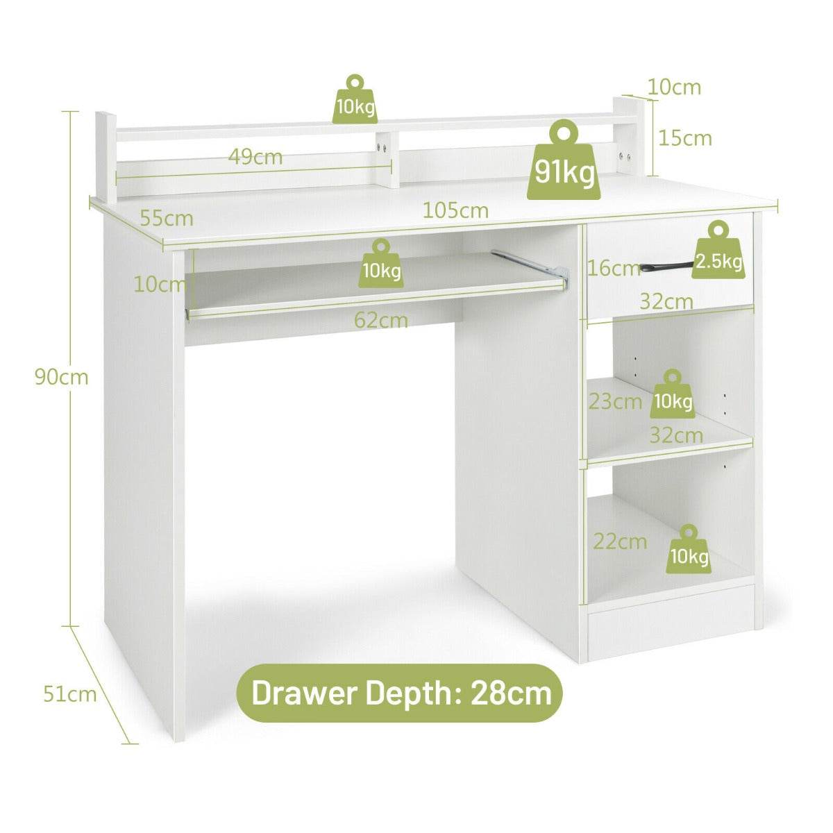 Colour: White Material: Engineered wood, MDF Overall dimension: 105 cm x 55 cm x 90 cm Drawer depth: 28 cm Weight capacity of desktop: 91 kg Weight capacity of display shelf: 10 kg Weight capacity of keyboard tray: 10 kg Weight capacity of drawer: 2.5 kg Weight capacity of open compartment: 10 kg (Each Tier) Overall weight capacity: About 134 kg Net weight: 33.5 kg Box Qty:1(May vary by batch)Package includes: 1 x Computer desk 1 x Instruction manual