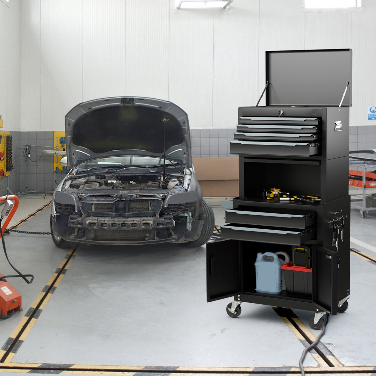 With high-grade metal structure, this 2-in-1 tool chest combo can withstand heavy weight, showcasing robust durability. With a top box, 6 drawers of varied sizes, 2-door bottom cabinet and side hooks for hanging tools, the tool cabinet offers ample storage space for your items. The top chest features auto-locks upon closing, safeguarded by a dual-key lock system, ensuring your tools are secured. And maneuverability is effortless with 10cm large wheels and a comfortable grip handle. This versatile cabinet thrives in various workspaces, enhancing efficiency whether in an auto shop or home garage. Upgraded Design: With 60cm cabinet width, this tool storage cabinet offers more storage space. And it features larger wheels with 10cm diameter and convenient handle which is thicker and more heavy-duty, thus more comfortable to grip. 2-in-1 Tool Chest: This rolling tool box organizer consists of 2 pieces, which can be independently used as you need. And you can detach the upper chest and put it into the bottom cabinet for saving space. Automatic Locking Design: The drawers of top chest can be opened when the cover is lifted. Such an automatic locking system ensures high-level security. And the upper and lower locks respectively come with 2 corresponding keys. Plus, the premium ball bearing drawer slides are designed for smooth opening and closing. Robust Metal Structure: The whole tool chest combo is mainly made of high-grade metal which is super sturdy and rustproof. Therefore, it can withstand long-time use and heavy weight up to 120kg. Versatile Applicable Occasions: The tool chest comes with four 360° swiveling wheels, 2 of which are lockable, ensuring simple movement. And it will highly improve your working efficiency in auto repair shop, tool room, garage, warehouse and so on.
