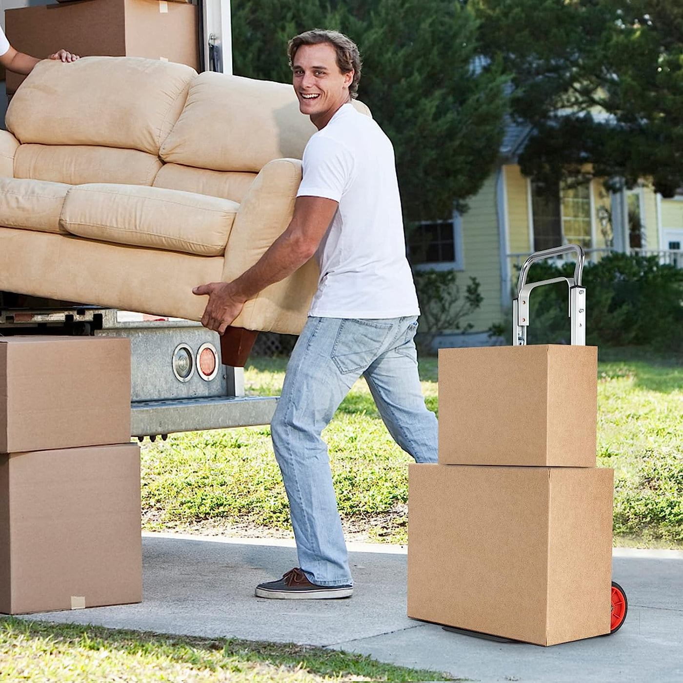 This foldable sack barrow will highly improve the efficiency of moving items. With aluminum square pipes and a sturdy metal plate, the carrier dolly cart is of high stability and strong load capacity. The suitable size of the plate allows you to carry more items at one time. Moreover, the aluminum pipe handle and durable wheels make movement much easier and more effort-saving. When not in use, the dolly trolley on wheels can be folded in seconds. And its compact folding size takes up little space for storage. All in all, this foldable and sturdy hand truck will bring you much convenience in your daily life. High-Grade Wheels and Adjustable Height: The hand truck is equipped with 2 all-terrain wheels which are wear-resistant and low-noise. Therefore, the folding hand cart is easy to move anywhere you want and saves much effort to carry items. Meanwhile, you can adjust the height by pushing the stretch lever forward to satisfy different needs.Easy to Fold and Expand: With a quick-folding design, the hand cart is space-saving for storage. To expand, you just need to pull out the handle with the folding telescopic handle, and then step on the metal plate until it turns flat.Heavy-Duty Aluminum Frame: This folding sack truck is mainly made of aluminum, which is lightweight yet sturdy. And the metal plate can load up to 100kg, which is large and solid enough to carry most items.Multiple Suitable Occasions: With strong load capacity and portable design, this aluminum hand trolley will help you a lot on different occasions. You can use the luggage cart in the warehouse, garage, backyard, and so on for more convenience.No Need to Assemble: The folding sack trolley has been fully assembled before delivery, so you just need to expand it for direct use. When finishing using it, you can store the dolly utility cart in the corner of your room or in the car trunk.