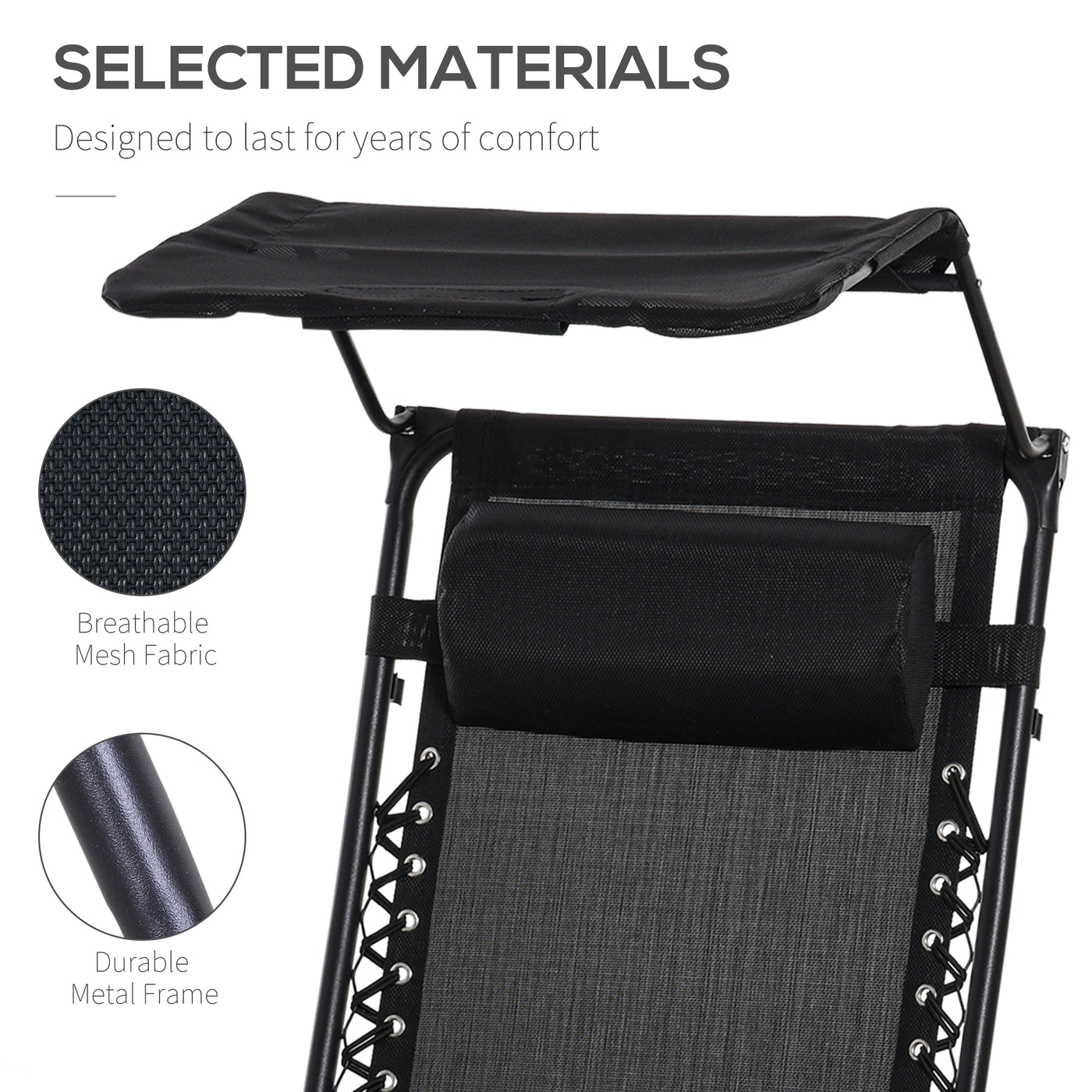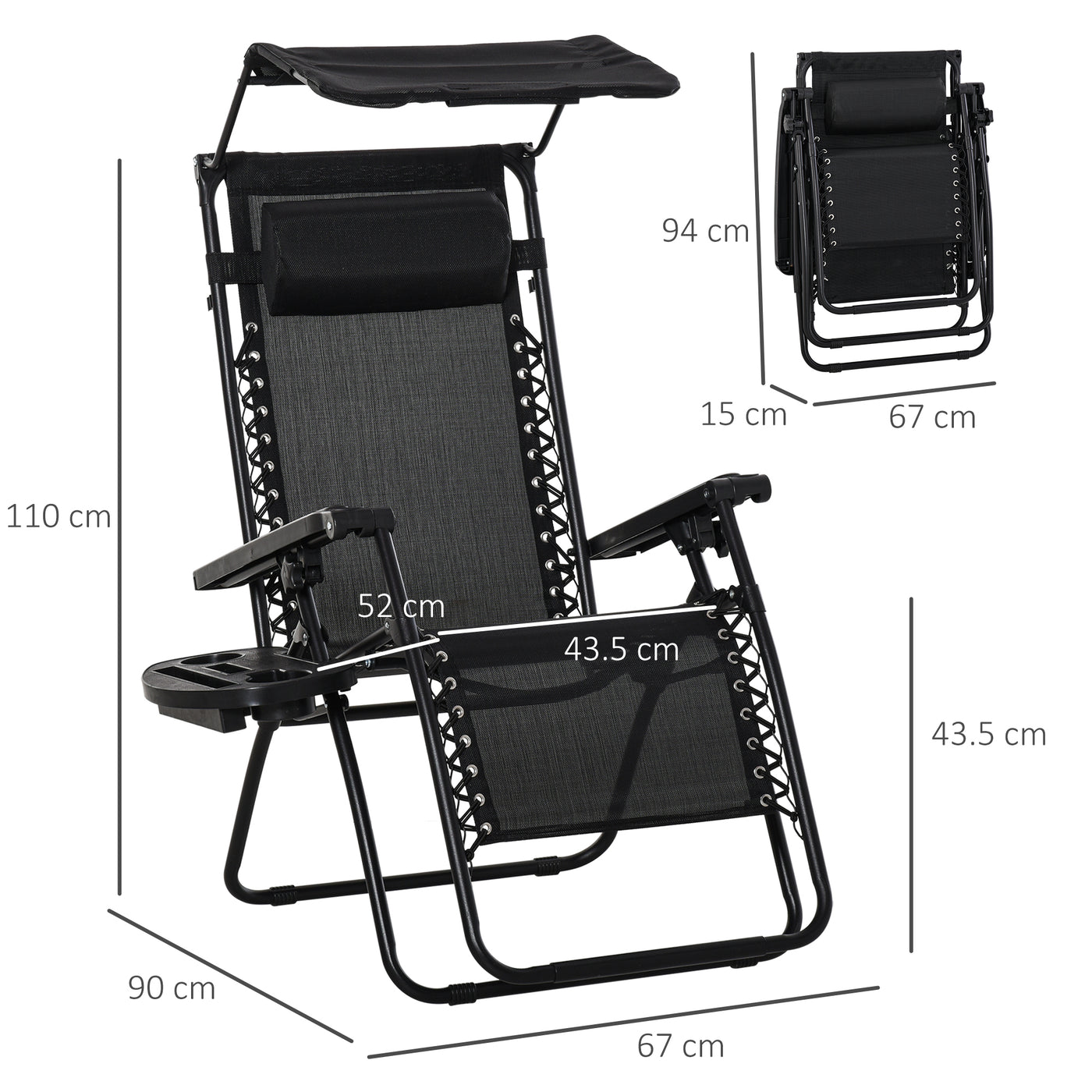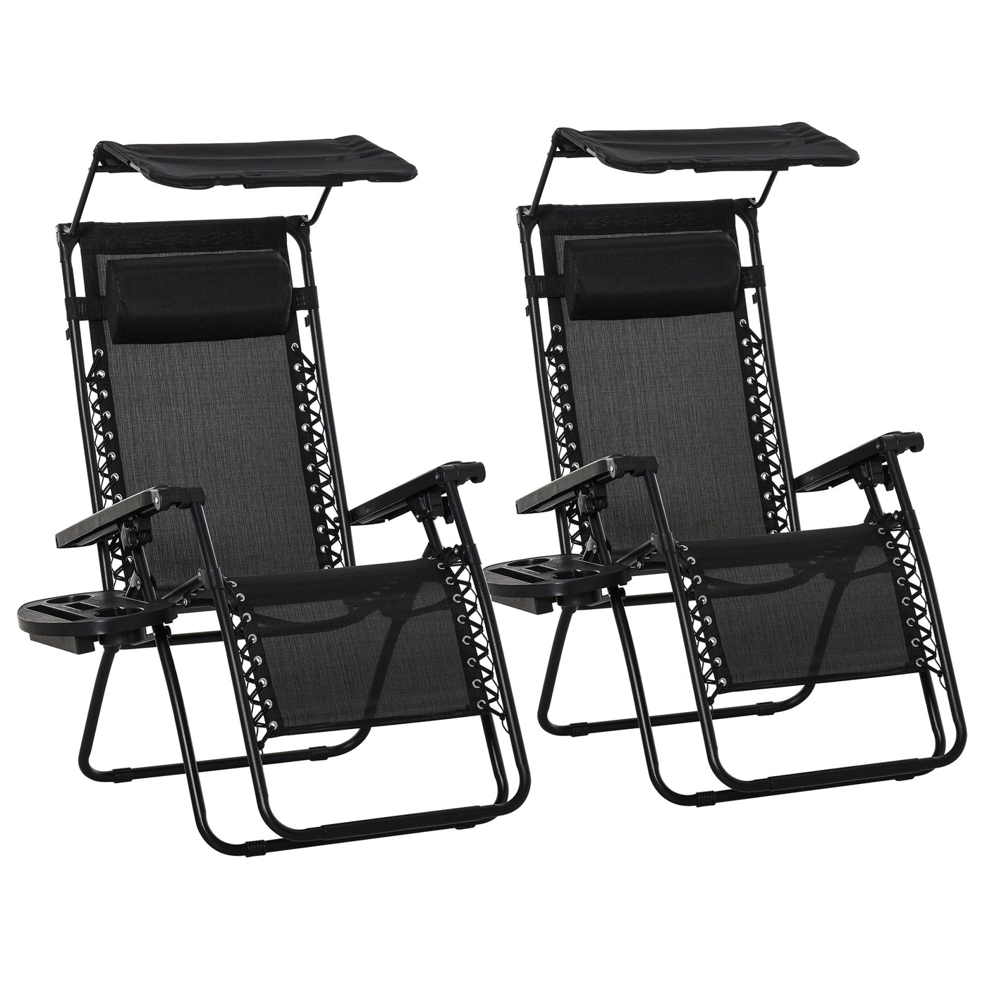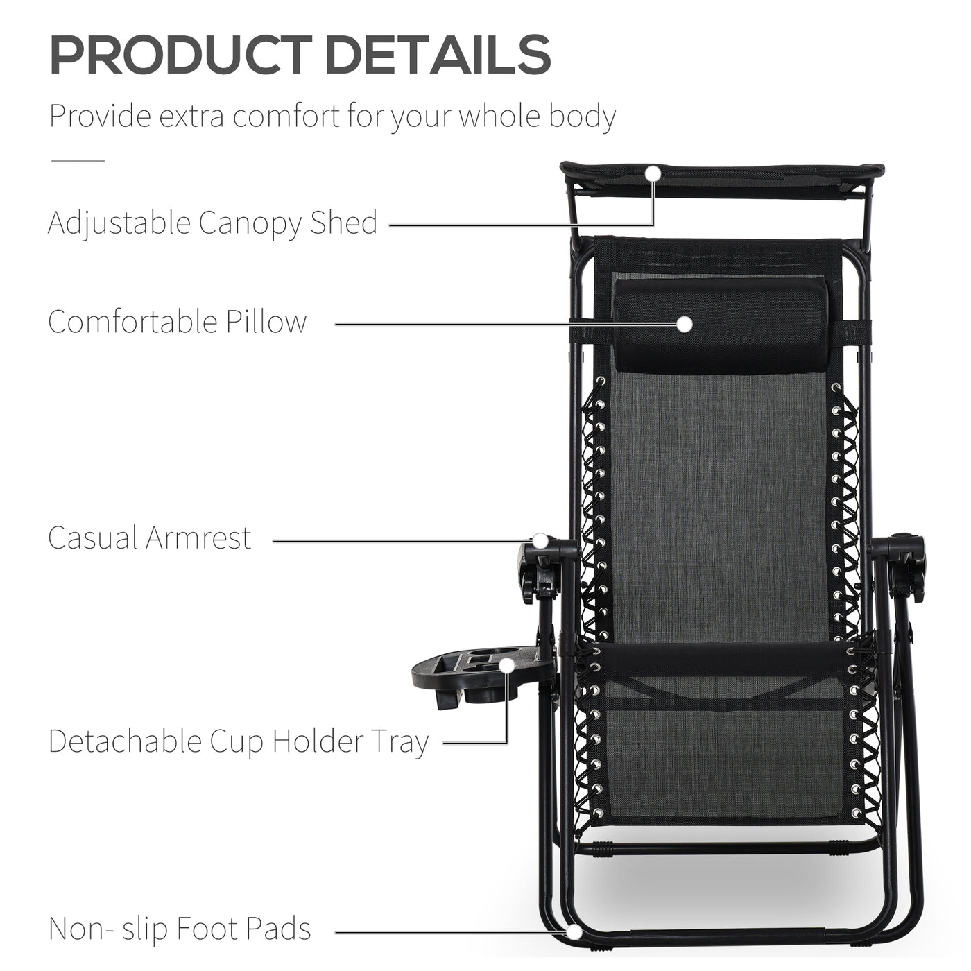 Outsunny 2 Piece Foldable Reclining Garden Chair with Headrest, Zero Gravity Deck Sun Lounger Seat Chair with Footrest, Armrest, Cup Holder & Canopy Shade, Black - Black