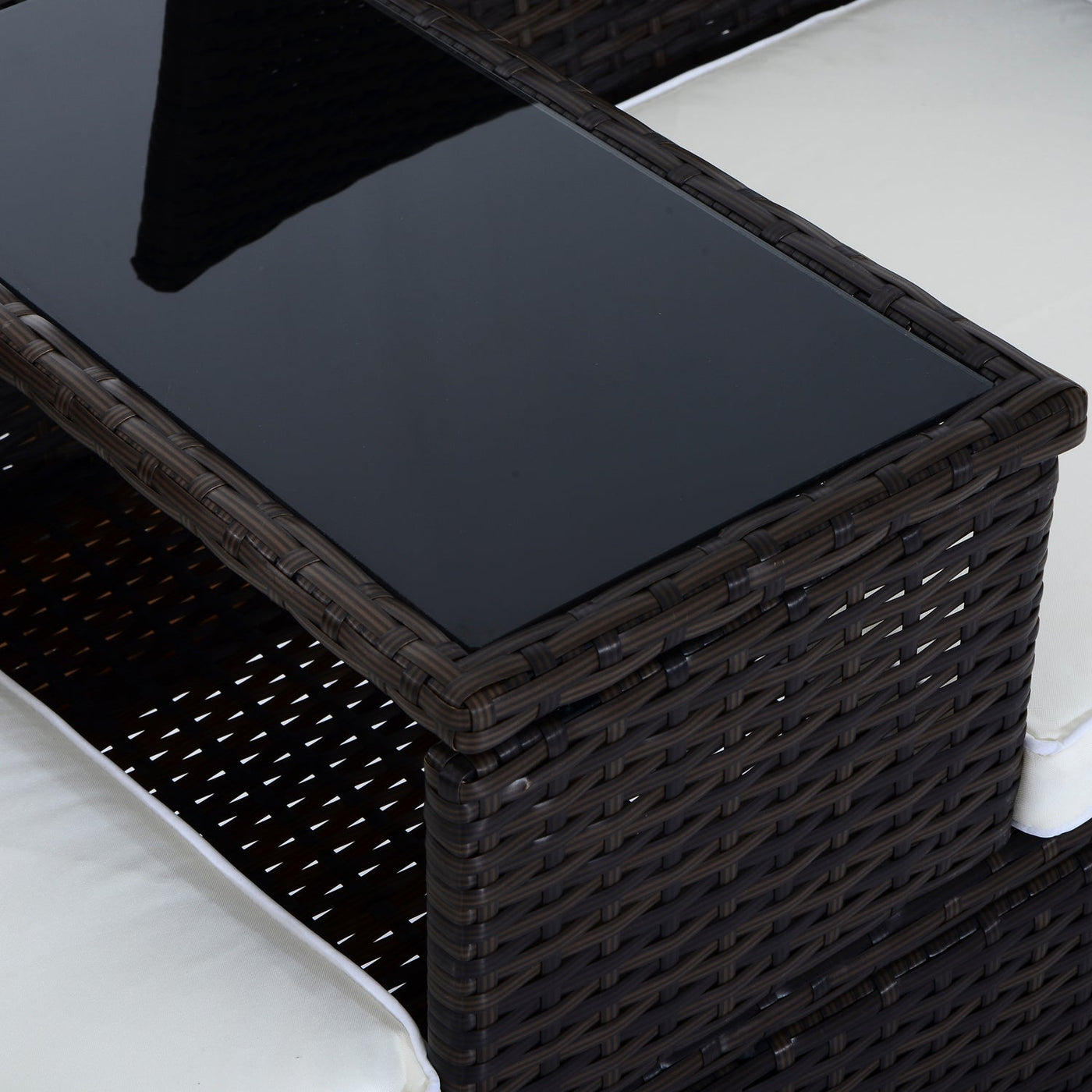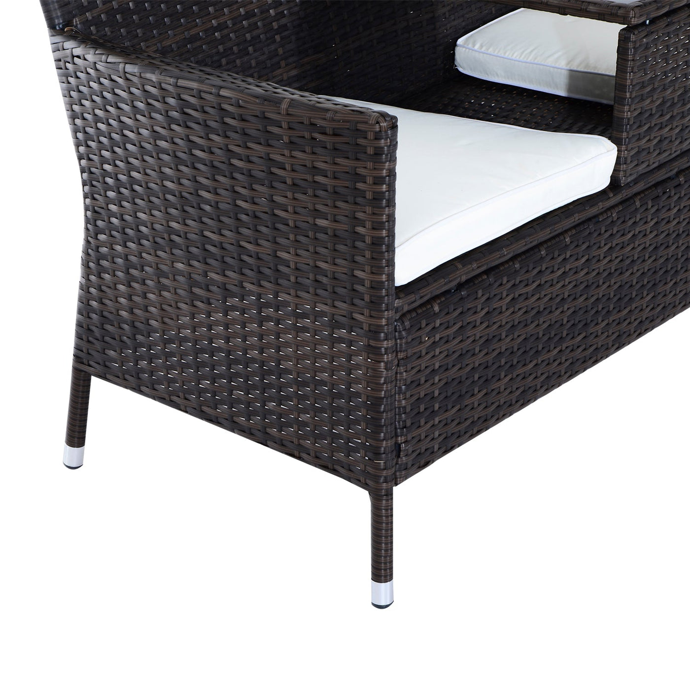 Make those wonderful times outdoors even better than before with this double seat rattan chair from Outsunny. Using metal for the base frame to provide underlying strength for seasons to come, it is crafted into an all-in-one two seat and middle table design – giving space for you to sit with a friend with a place to keep drinks, books and smaller items right next to you. Dark grey in colour, PE wicker rattan is wrapped around the metal, giving this duo seat style and protection against mild weather damage to make it a long lasting addition in your garden. Fire-retardant for safety, thick cushions are placed on the seats for comfort, with water-resistant covers which can be cleaned for hygiene, with thick tempered glass on the table for a smooth and sleek surface which is easy to keep clean.