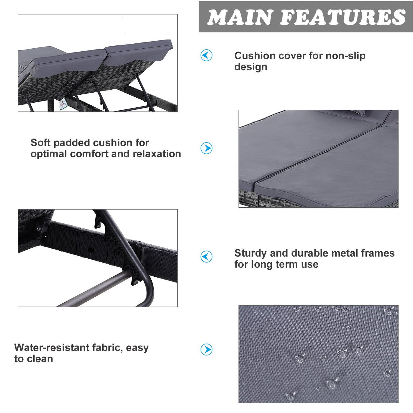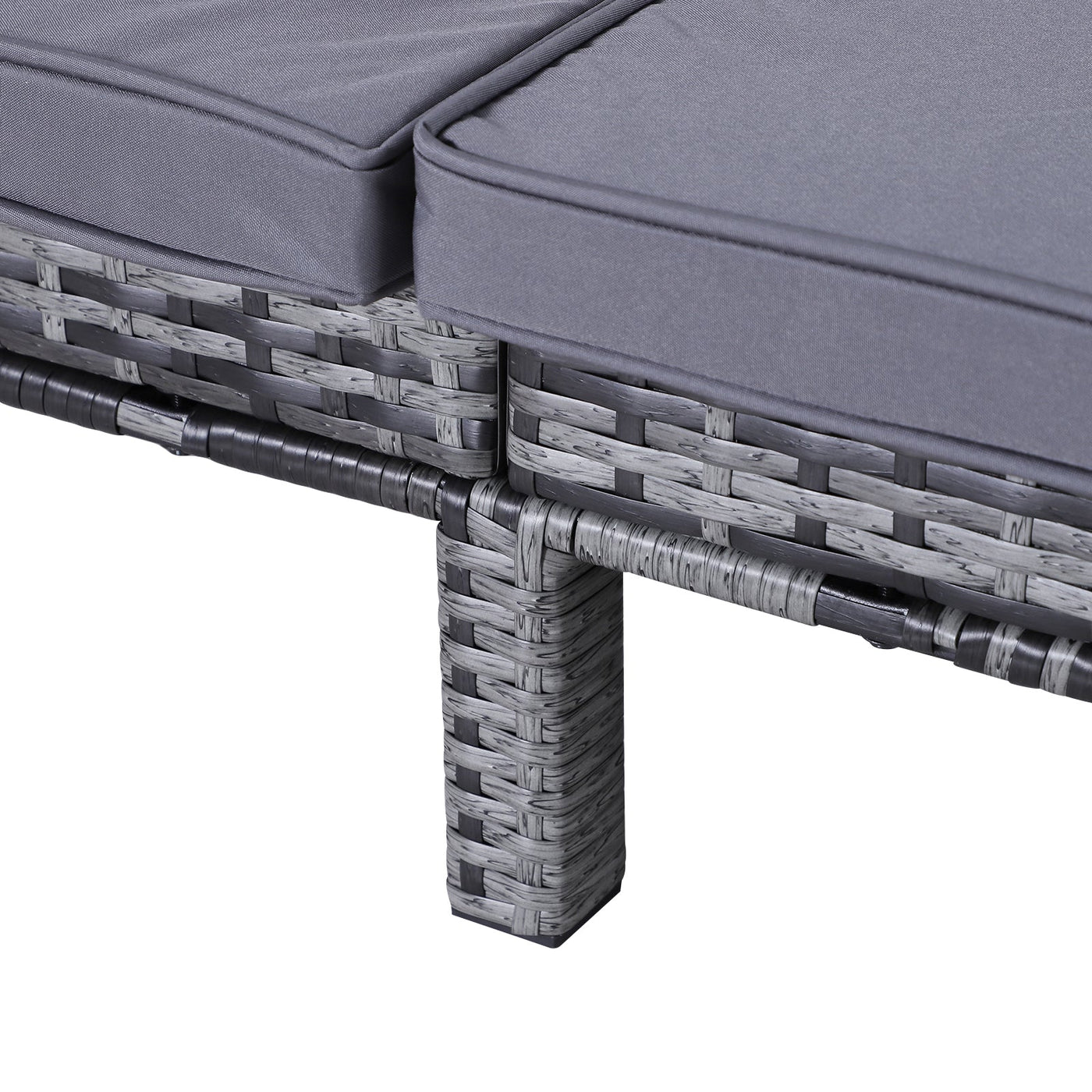 Outsunny 2 Seater Rattan Lounger Adjustable Double Chaise Chair Loveseat w/ Cushion - Grey - Grey