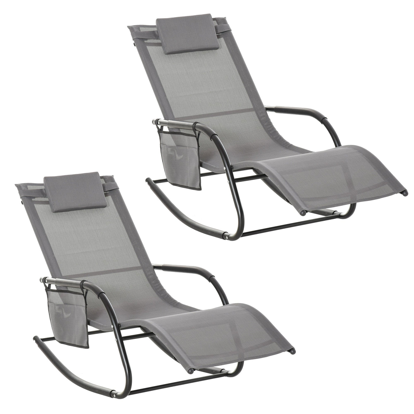 Outsunny 2PCs Outdoor Garden Rocking Chair, Patio Sun Lounger Rocker Chair with Breathable Mesh Fabric, Removable Headrest Pillow, Armrest, Side Storage Bag, Grey - Grey