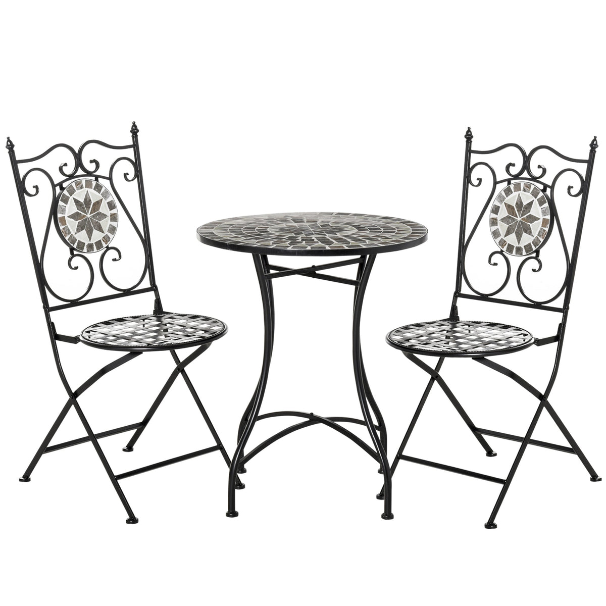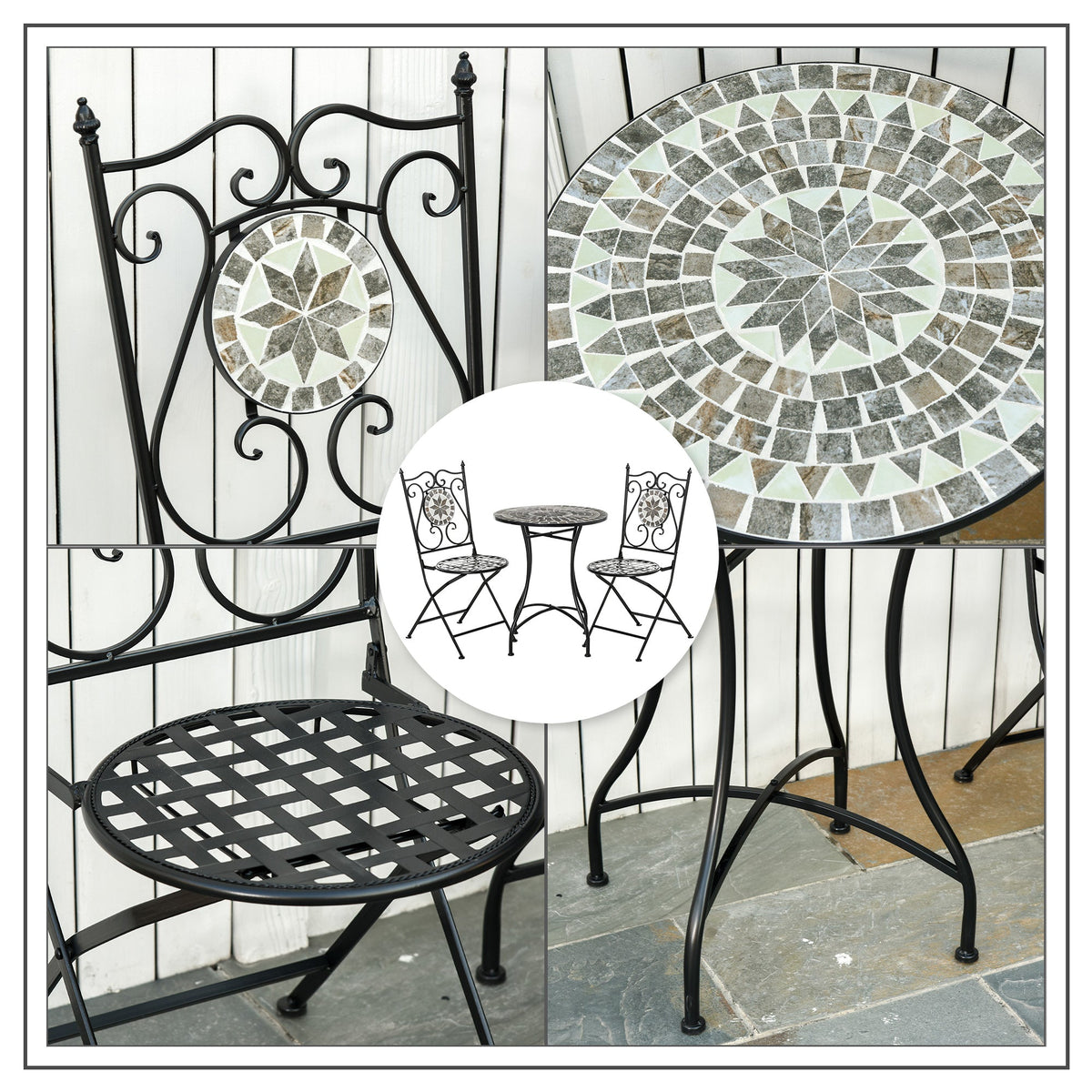 Outsunny 3 Pcs Mosaic Tile Garden Bistro Set Outdoor Seating w/ Table 2 Folding Chairs Set Metal Frame Elegant Scrolling Indoor Patio Balcony - Grey