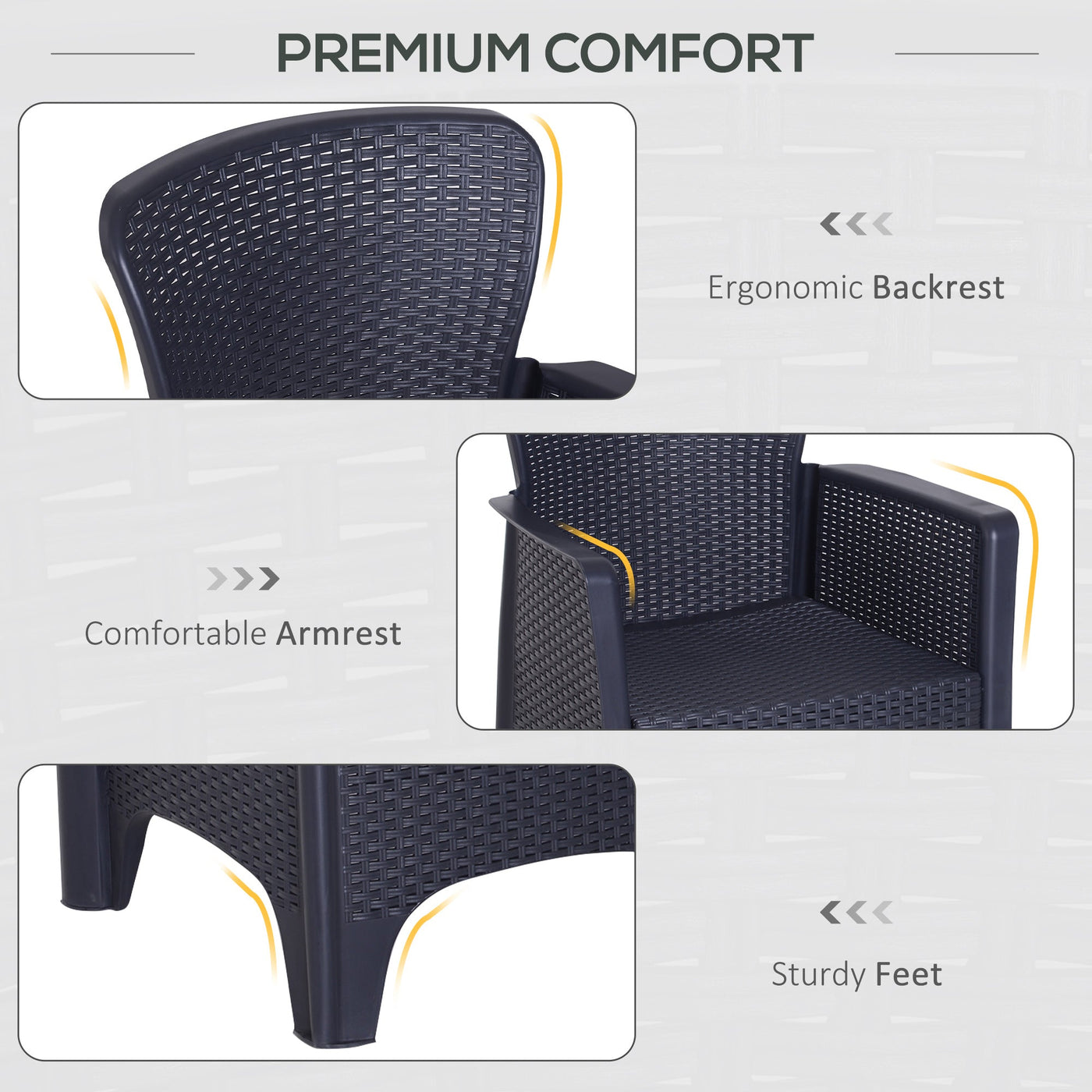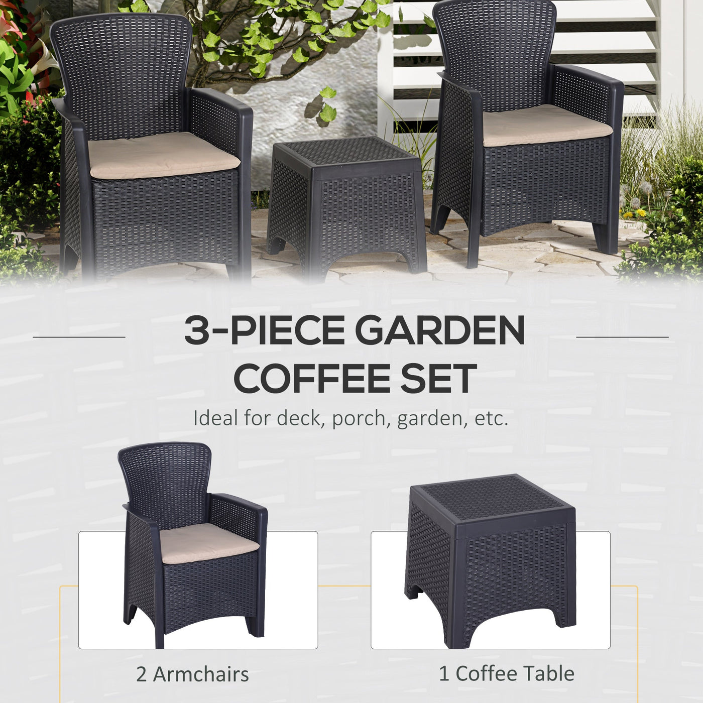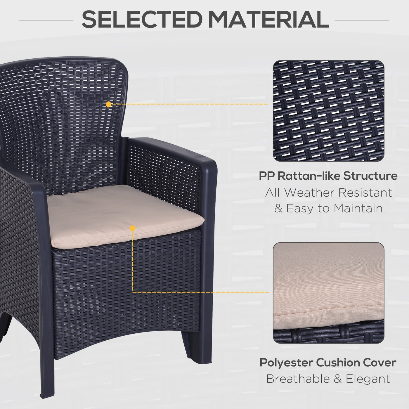 Relax stylishly and comfortably with garden bistro sets from Outsunny. Made from high quality PP material, this balcony furniture is easy to maintain and is weather-resistant, meaning that you don't need to worry about moving it indoors and outdoors weather dependant, and each piece has been made to last with you for years of use. Both seats come with thick padded cushions so you can sit down and relax for hours on end. Our patio table and chairs are the perfect excuse for inviting friends and family over!