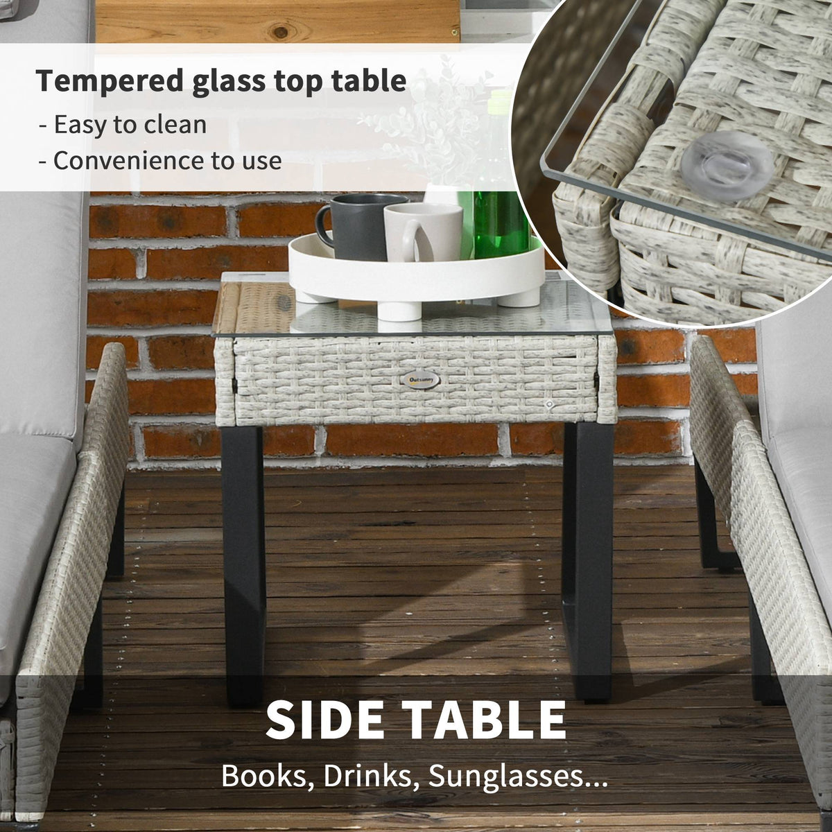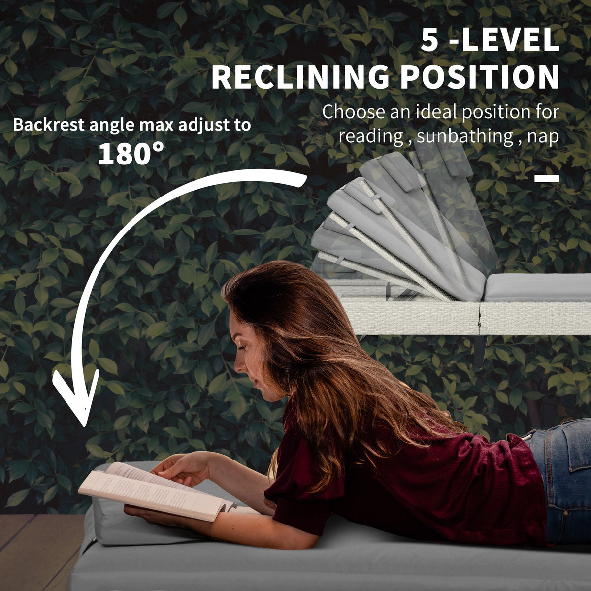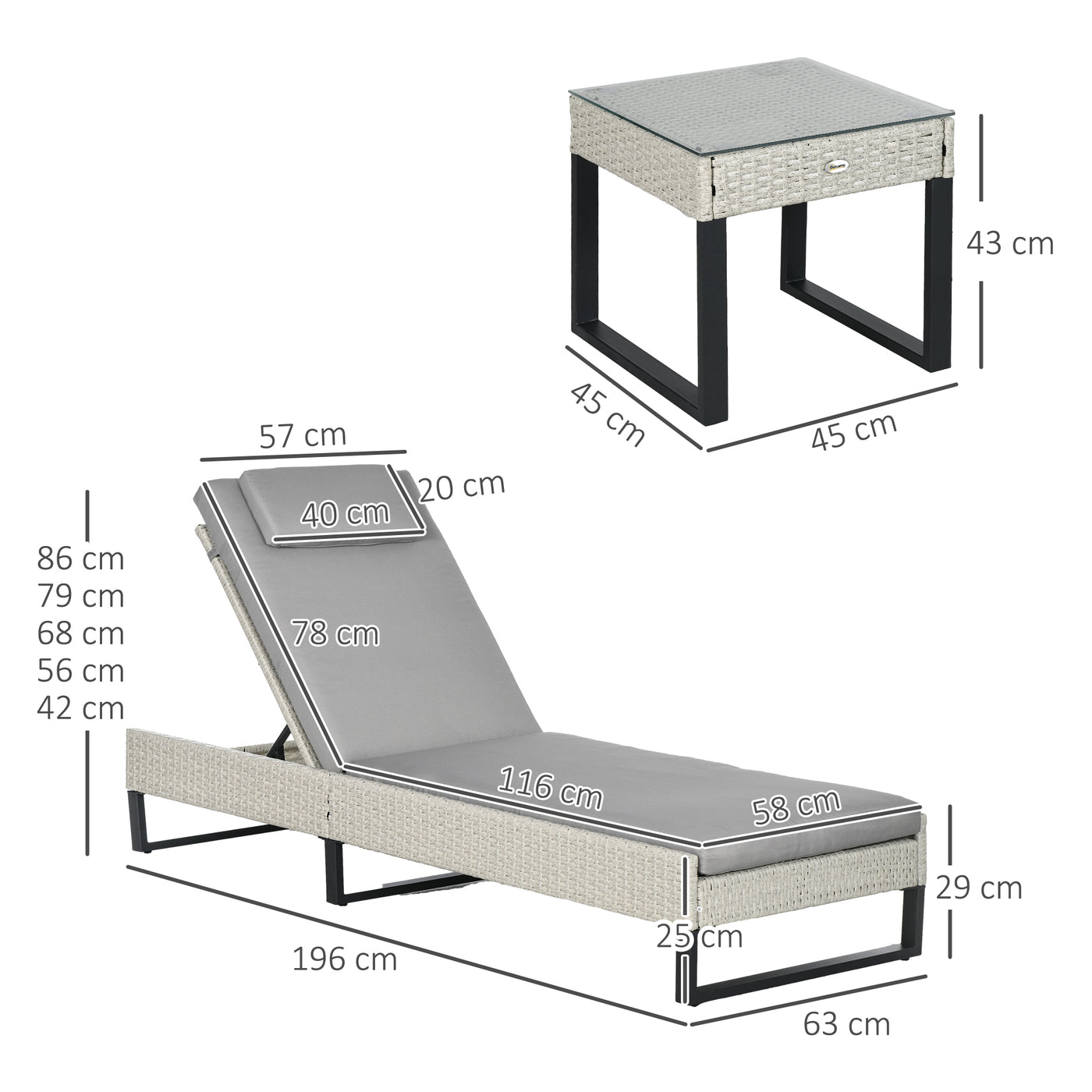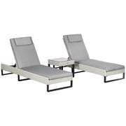 Outsunny 3-piece PE Rattan Sun Lounger Set with Adjustable 5-Position Recliner, Patio Chaise Lounge Chair Set with Cushions, Headrests, Glass Top Square Coffee Table, Light Grey - Light Grey