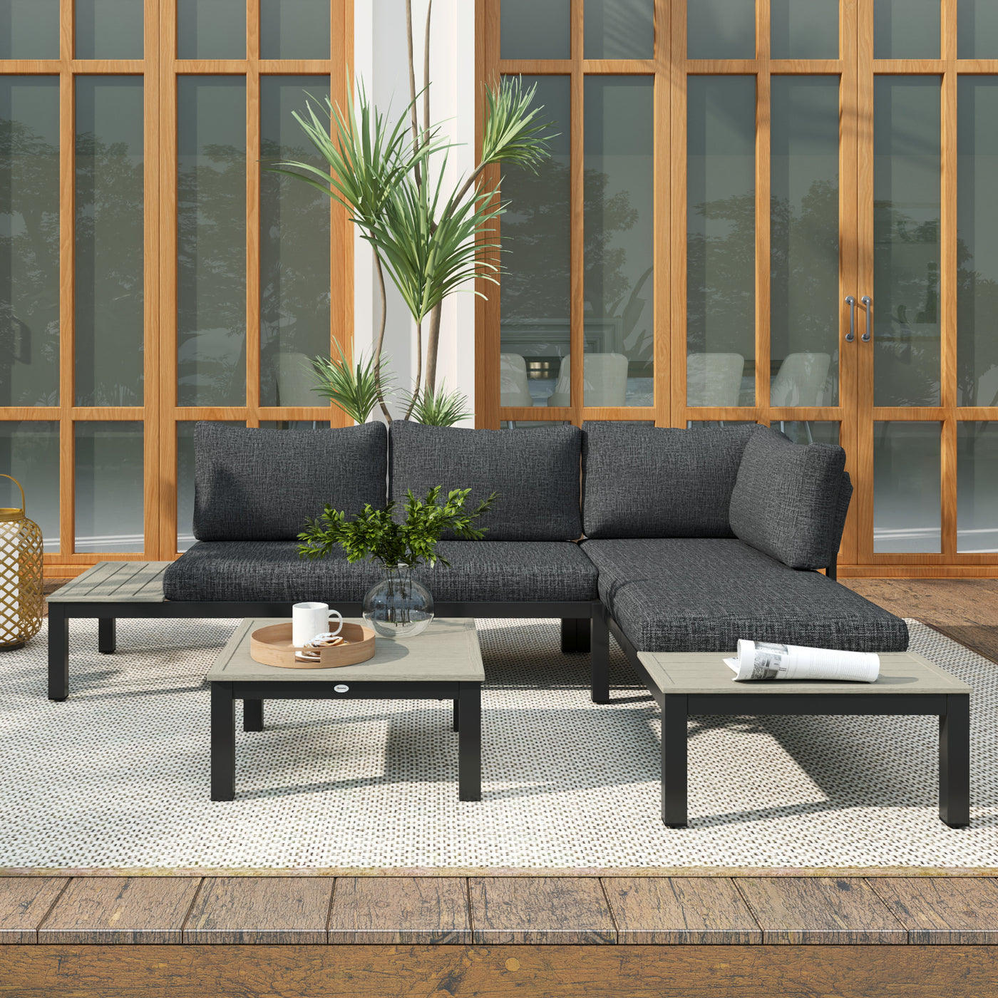 Outsunny 3 Pieces Garden Furniture Set, Aluminium 4 Seater Corner Sofa Set with 2 Loveseats, Coffee Table and Side Trays, Outdoor Conversation Furniture with Cushions for Garden, Dark Grey - Dark Grey