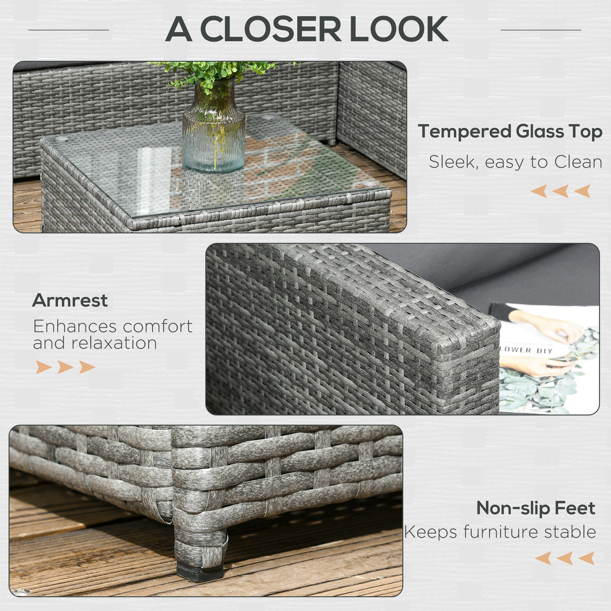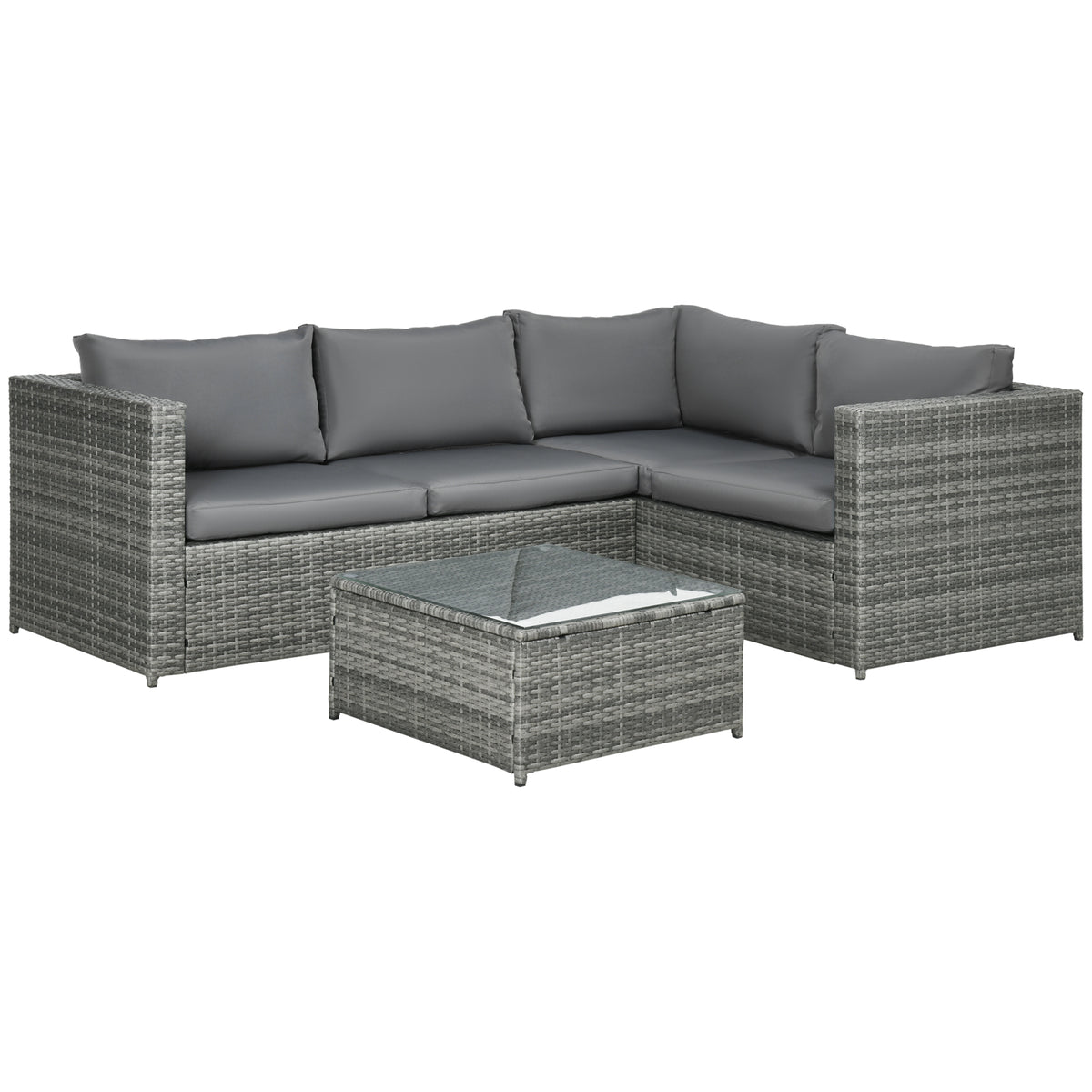 Outsunny 3 Pieces PE Rattan Garden Furniture Set with 10 cm Thick Cushions, 4 Seater Garden Corner Sofa Set with Glass Top Coffee Table, Outdoor Furniture for Patio, Porch, Grey - Grey