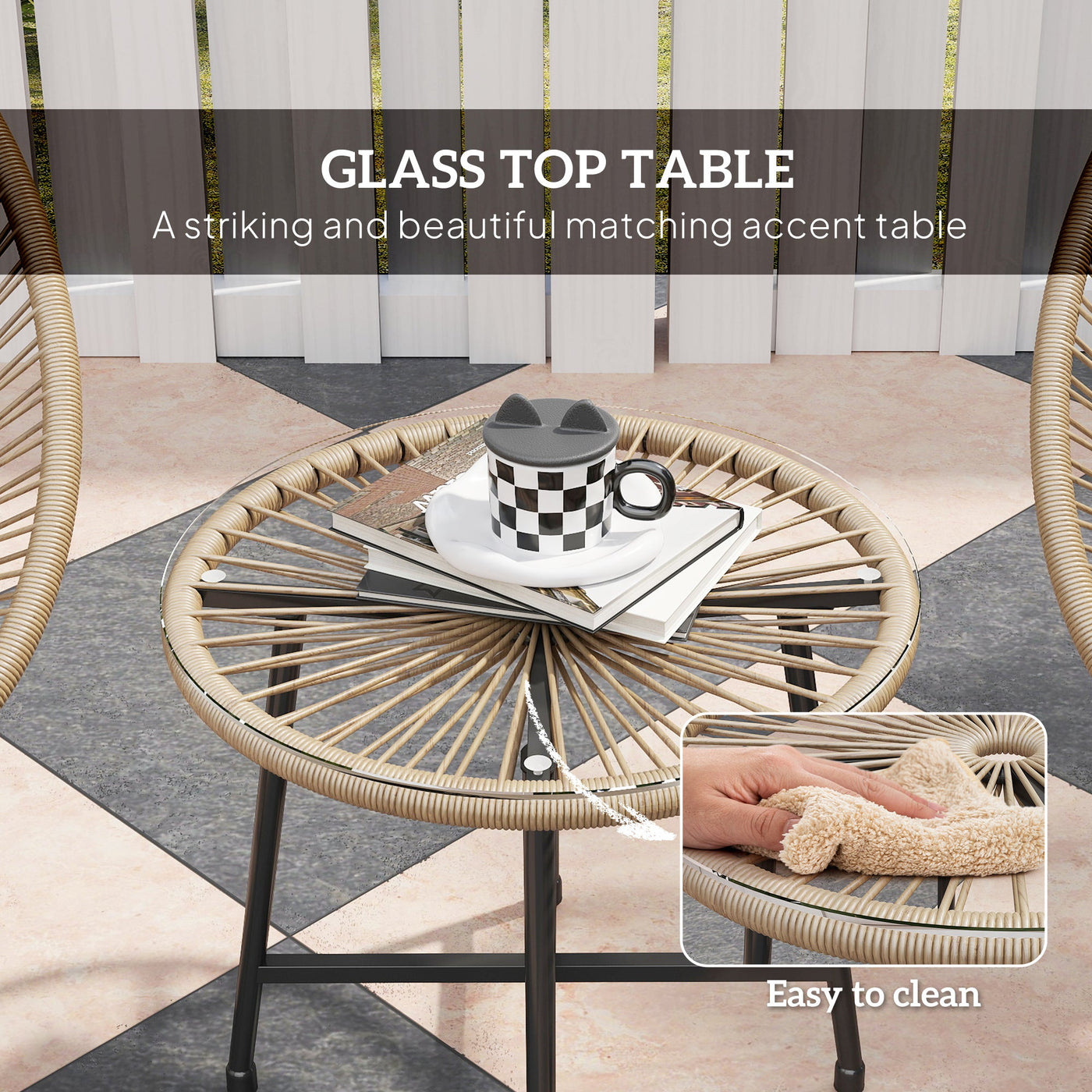 Outsunny 3 Pieces Rattan Bistro Set, Garden Bistro Set with Acapulco Chairs and Glass Top Table, Small Garden Furniture Set with Reinforced Metal Frame for Outdoor, Patio, Balcony, Natural - Natural wood finish