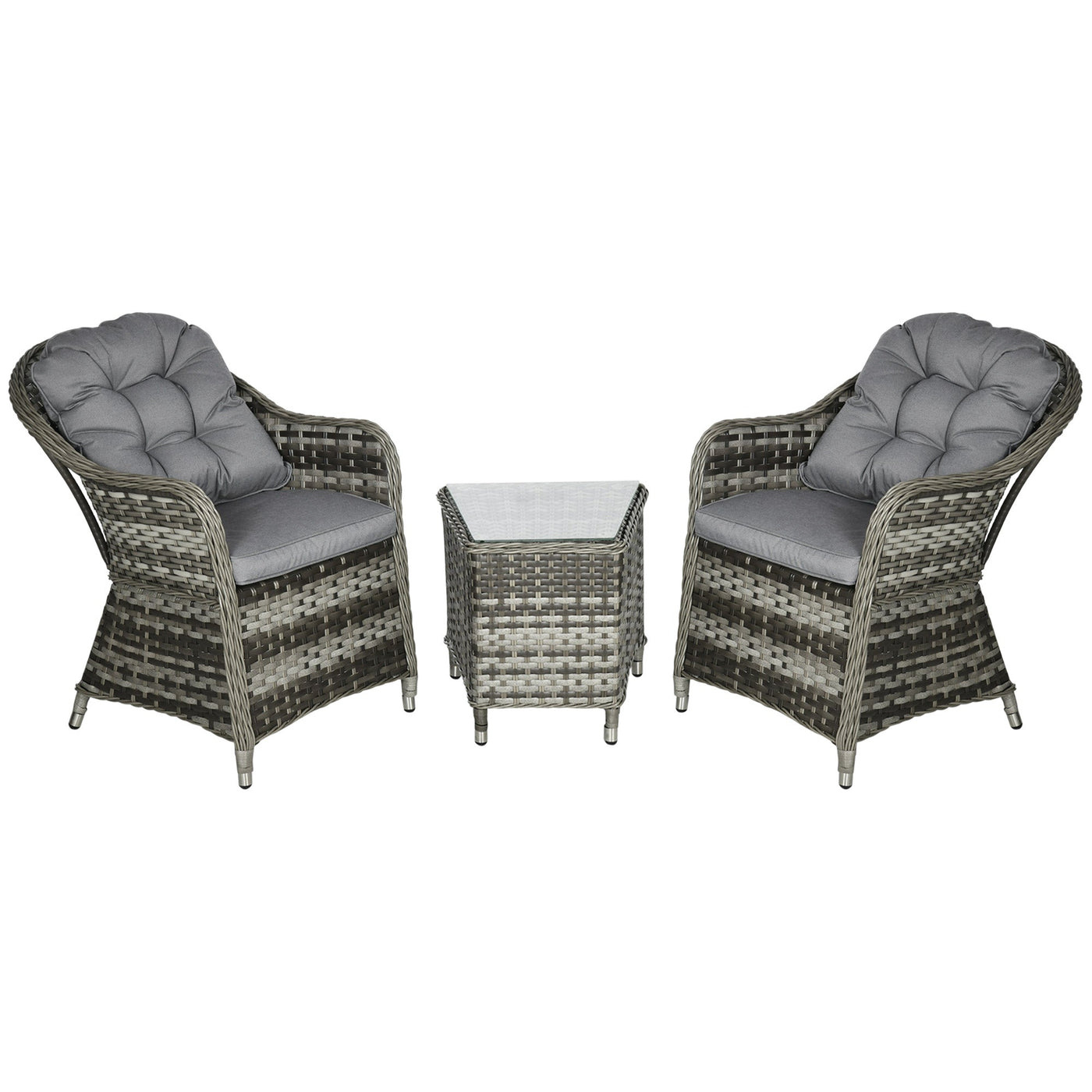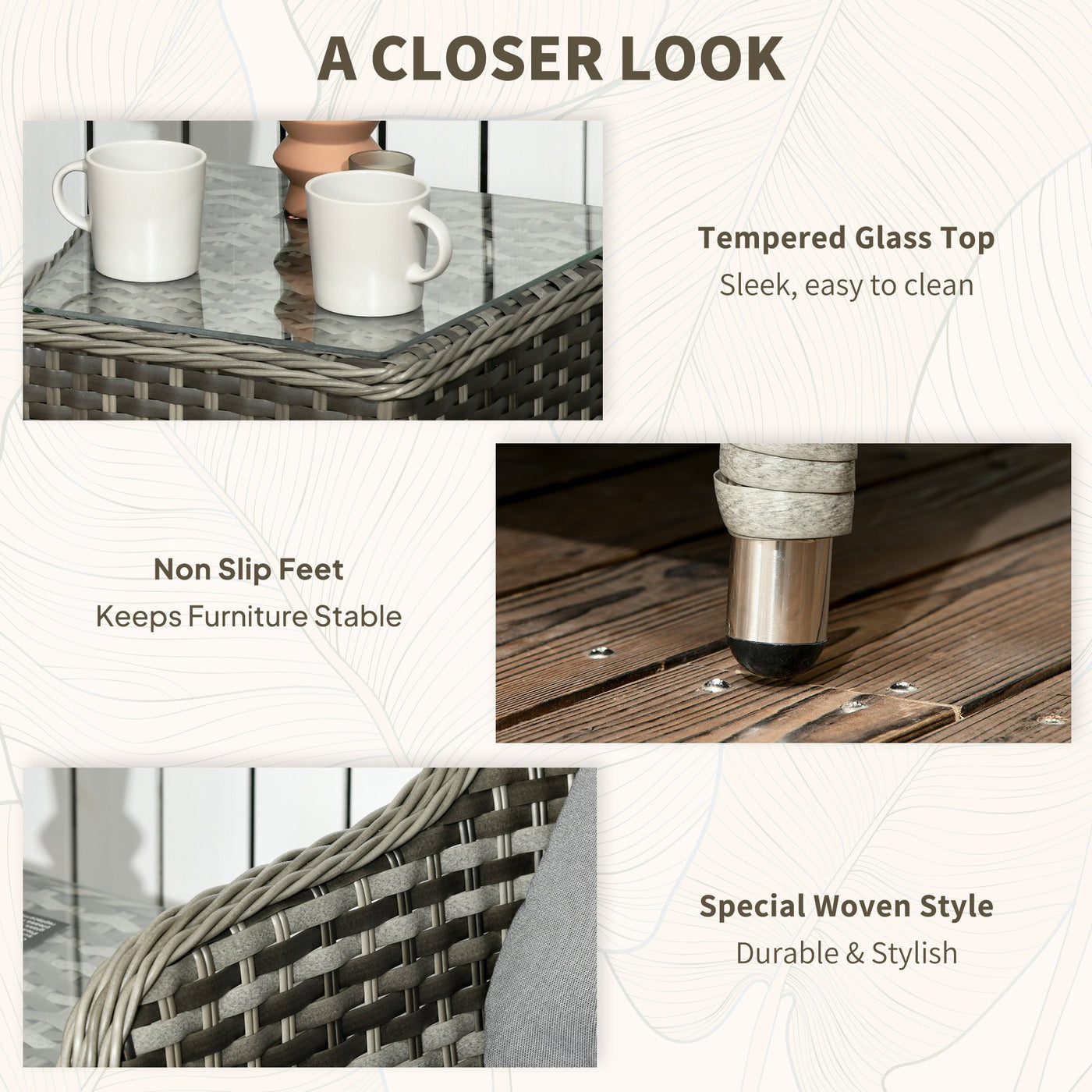 Outsunny 3 Pieces Rattan Bistro Set, Wicker Garden Bistro Set, Glass Top Balcony Table and Chairs with Cushions for Outdoor, Patio, Balcony, Grey - Grey