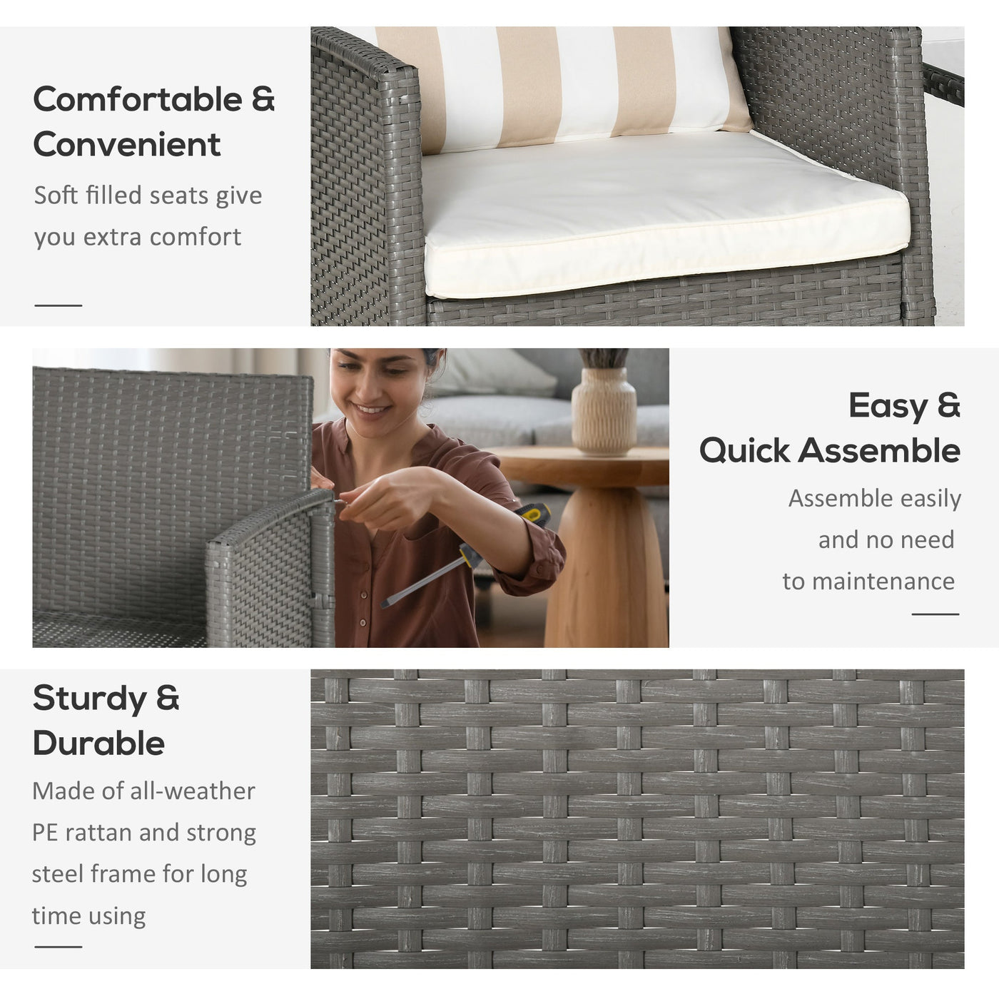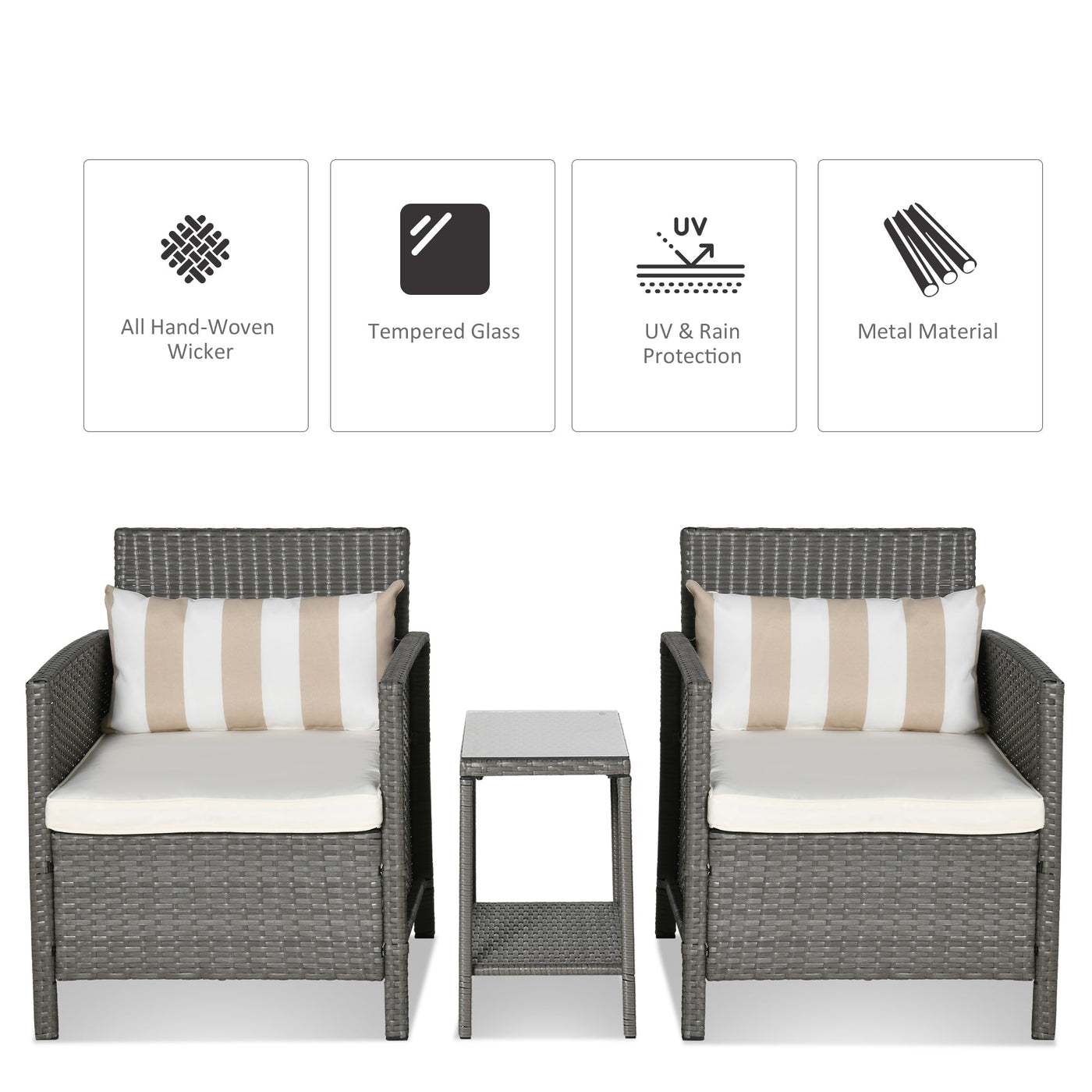 Outsunny 3 Pieces Rattan Bistro Set, Wicker Garden Furniture Set, Glass Top 2-tier Coffee Table and Chairs Set with Pillows and Washable Cushions for Outdoor, Patio, Balcony, Light Grey - Light Grey