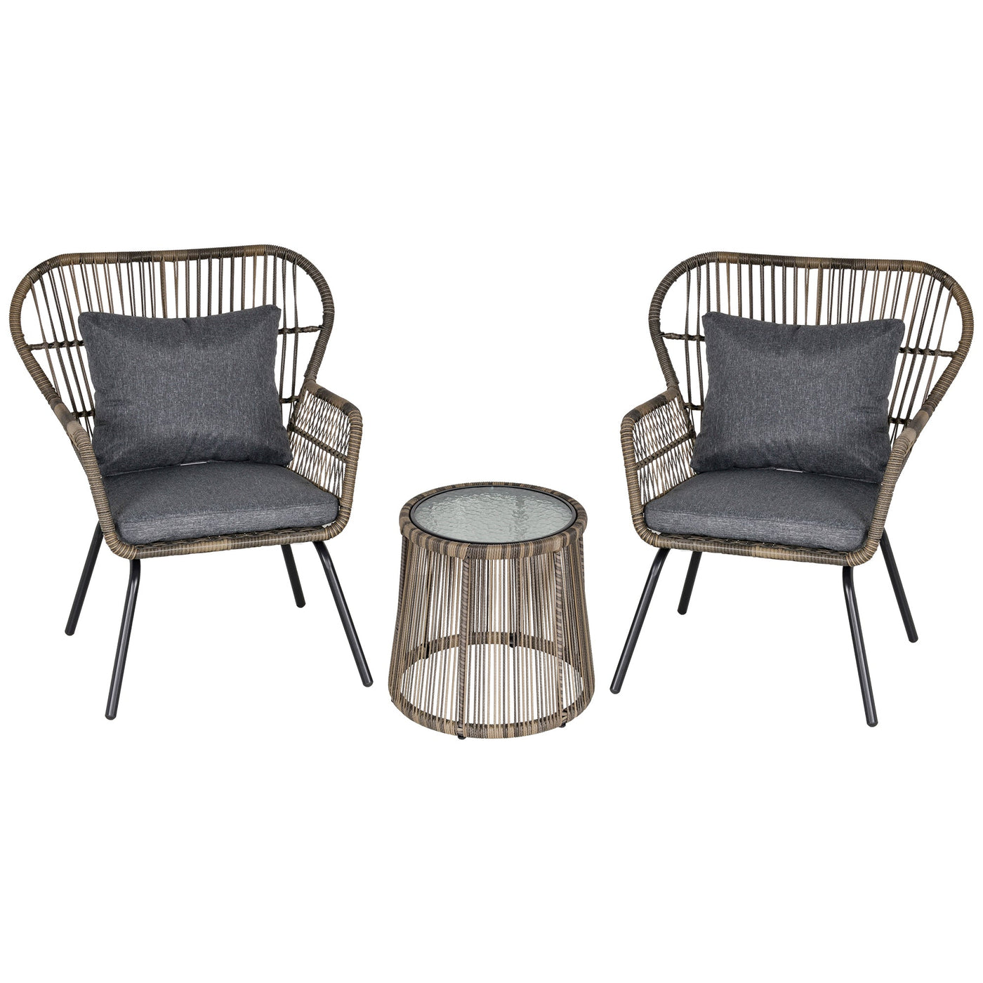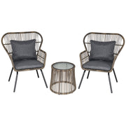 Outsunny 3 Pieces Rattan Bistro Set, Wicker Garden Furniture Set with Cushions, Glass Top Coffee Table and Chairs for Outdoor, Patio, Balcony, Grey - Grey