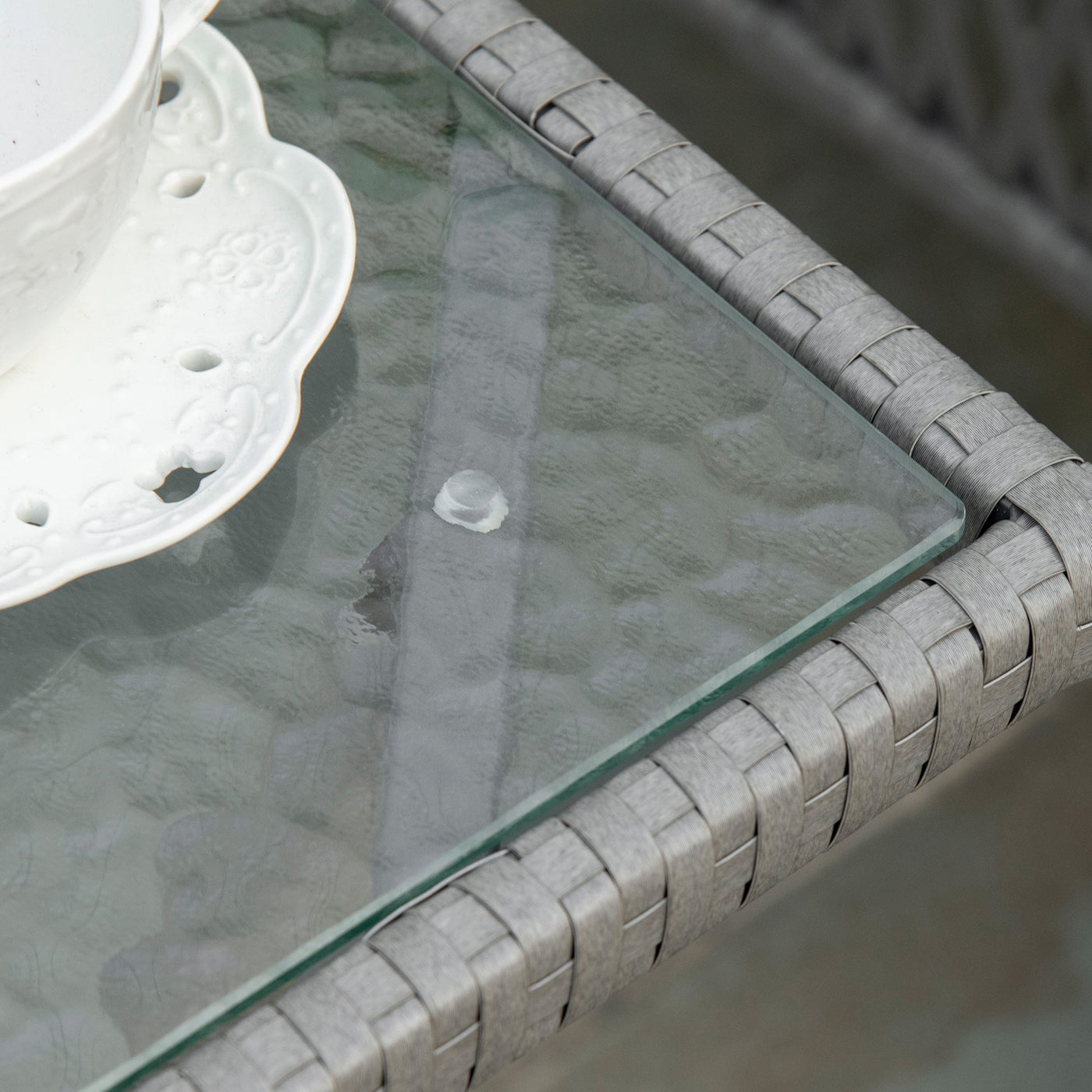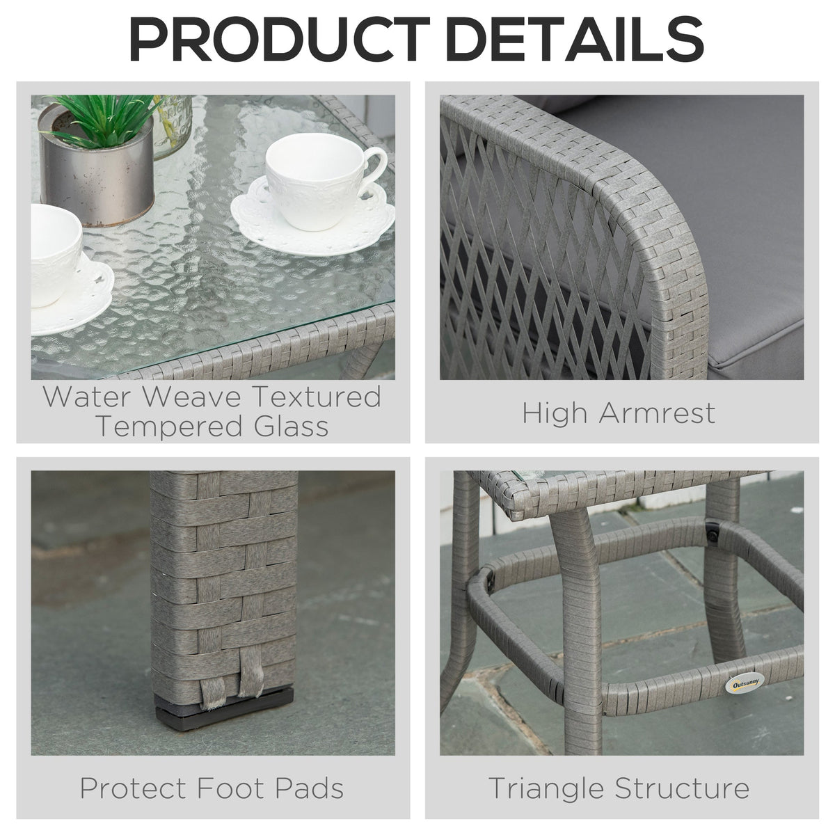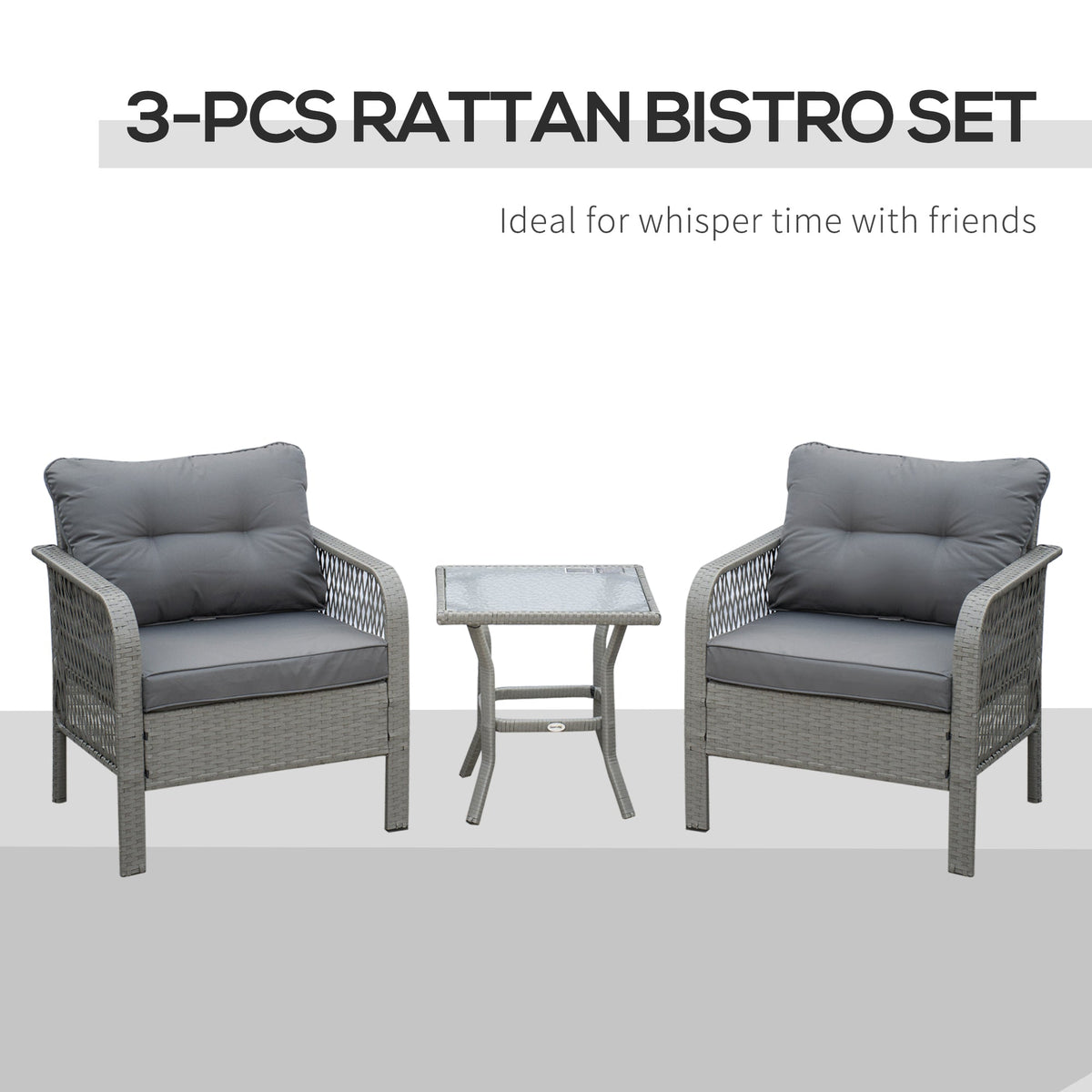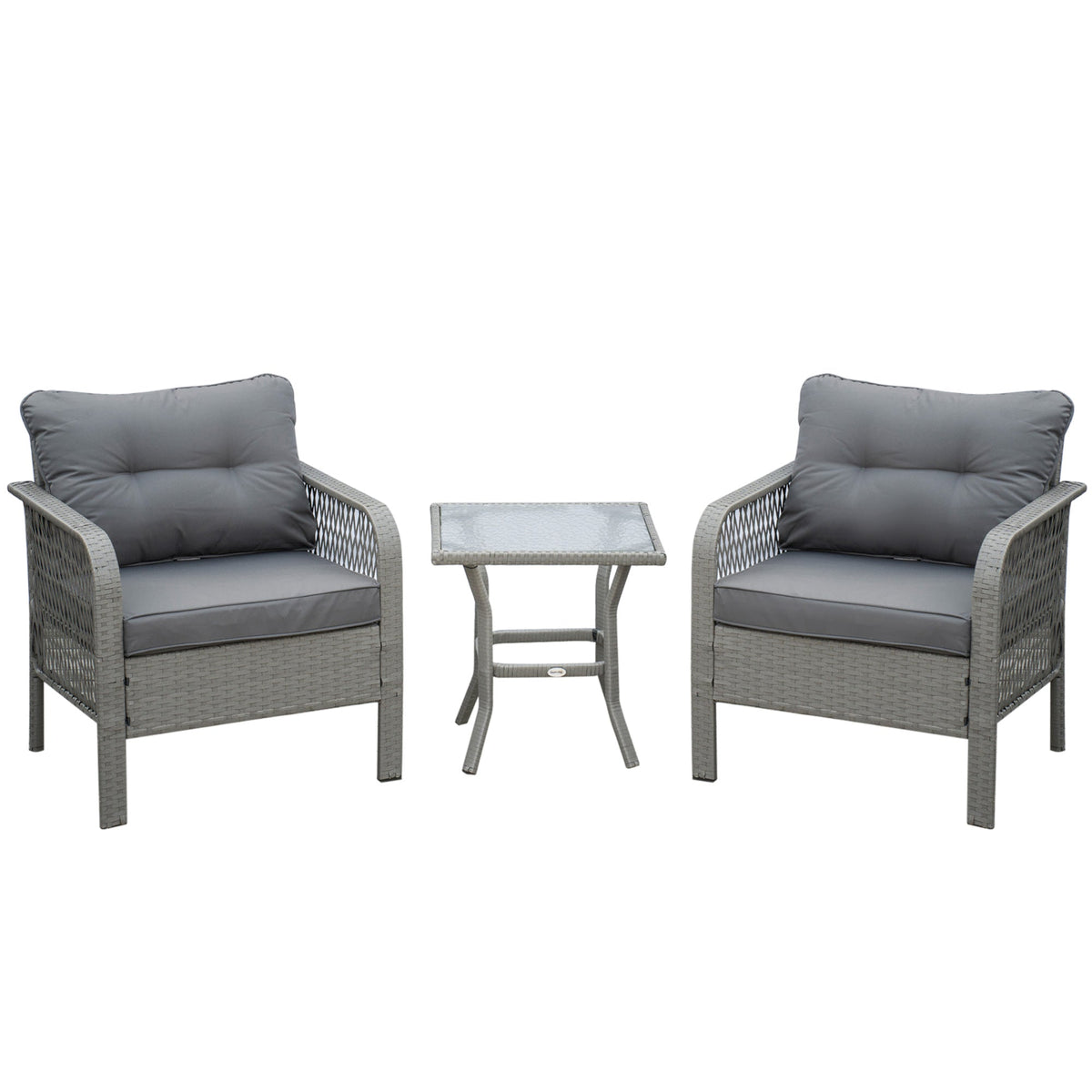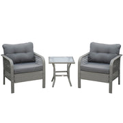 Outsunny 3 Pieces Rattan Bistro Set with Glass Top Coffee Table, Chairs and Cushions for Outdoor, Patio, Balcony, Grey - Grey