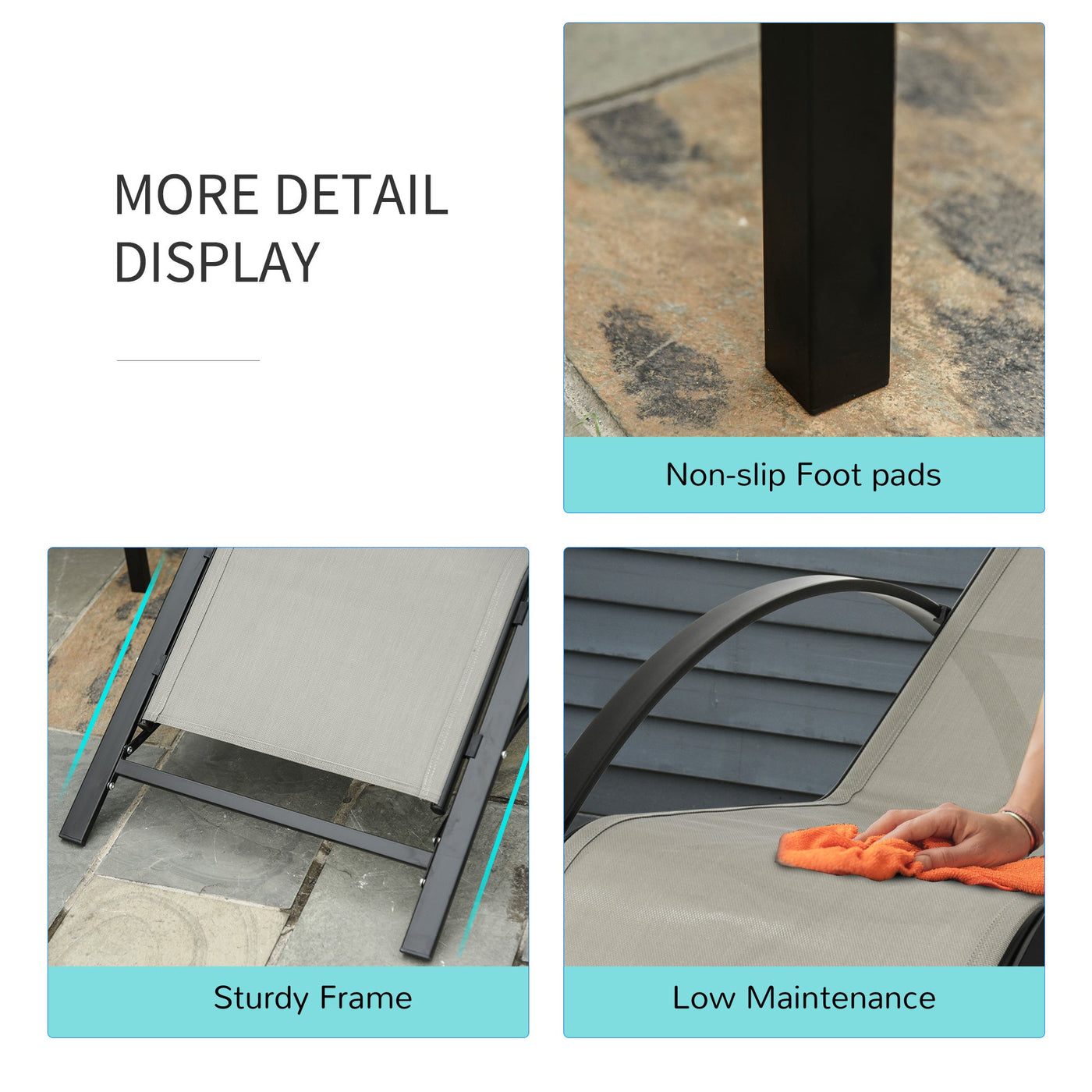 Refresh your outdoor space with the garden recliner chairs set of 3 Outsunny. Using metal for the frame of both chairs and a table, the structure is tough and durable, so it can be used every day. The sun loungers for garden are wrapped in breathable mesh for comfort and smoothness on the skin. The table comes with a thick glass top for a safe and secure holding place. Stylish and functional, this set is perfect for patios, gardens, balconies and any other outdoor space. Assembly is required.