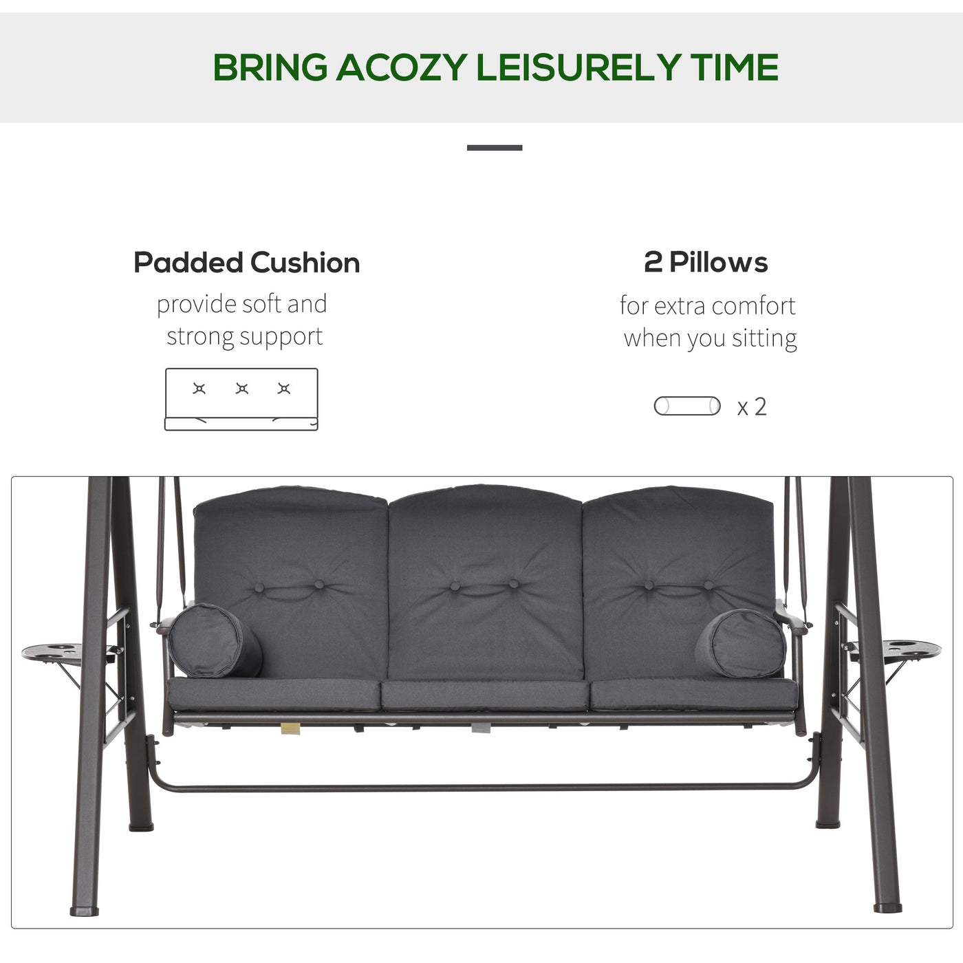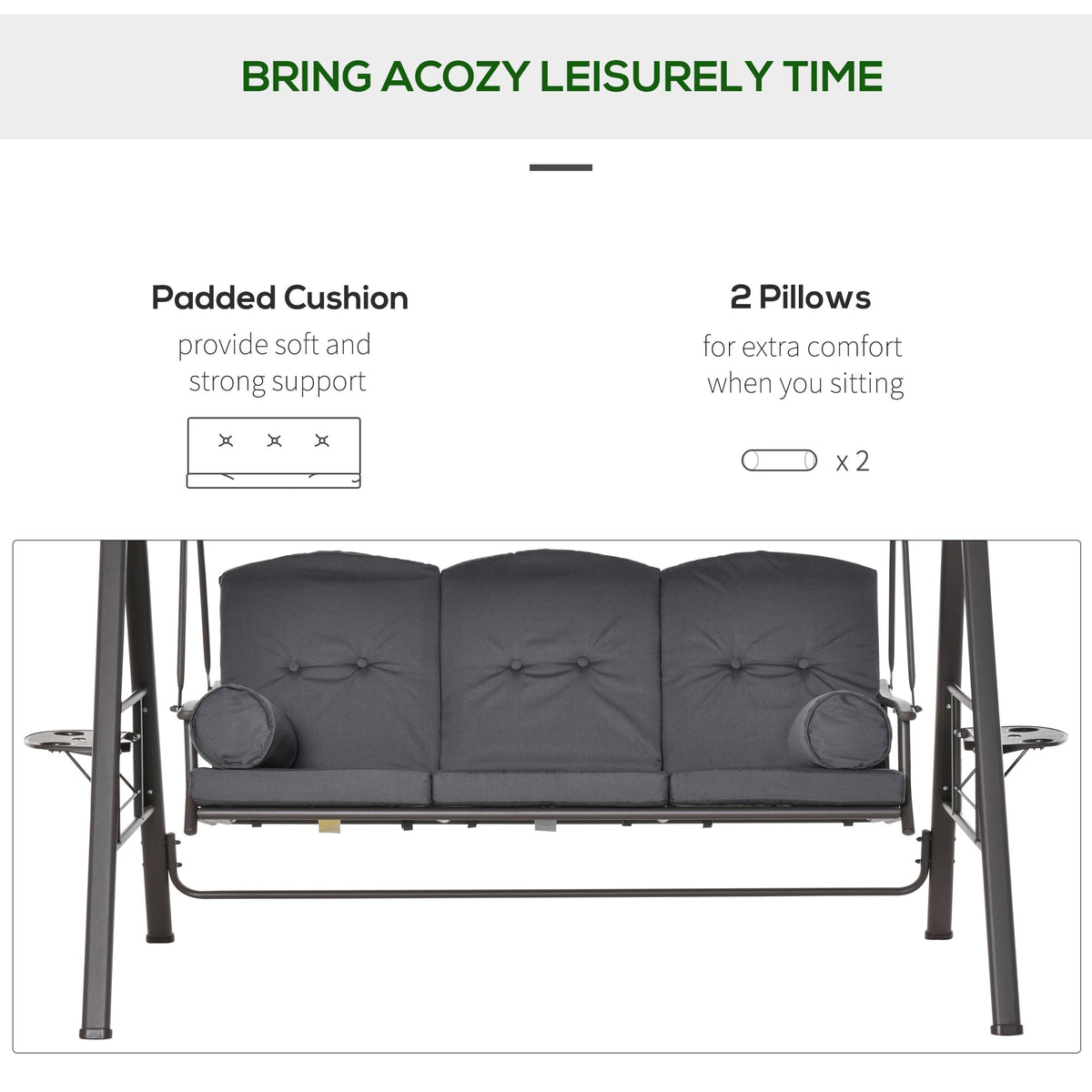 Outsunny 3 Seater Garden Swing Chair Outdoor Hammock Bench w/ Adjustable Canopy, Cushions and Cup Trays, Brown Steel Frame, Dark Grey Fabric - Grey
