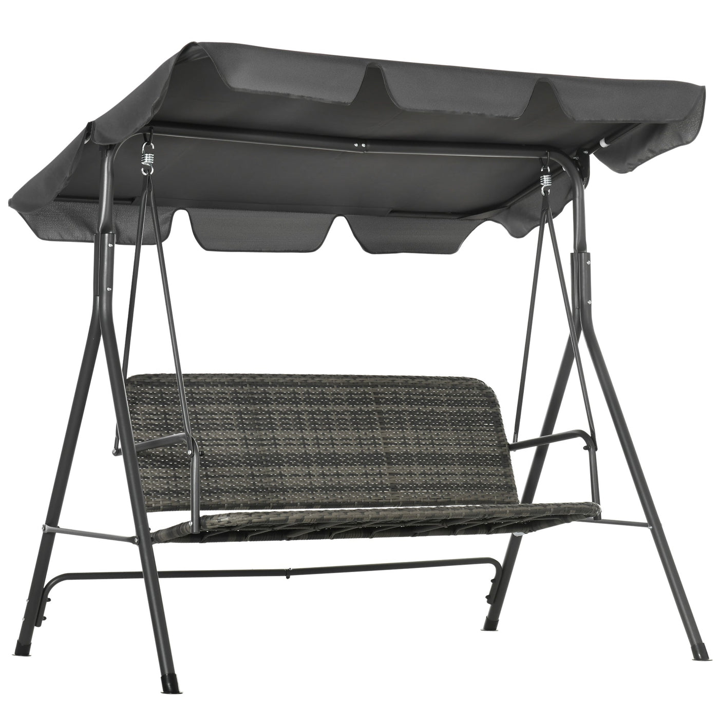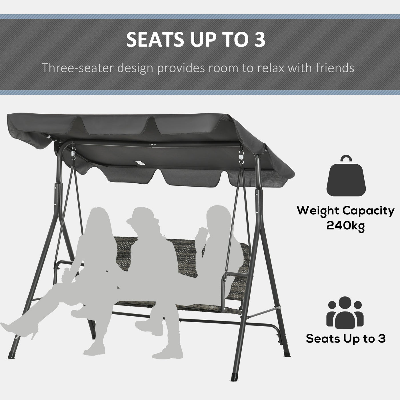 Outsunny 3-Seater Outdoor PE Rattan Swing Chair, Patio Wicker Hanging Swing Bench with Steel Frame Stand & Adjustable Canopy, Grey - Grey