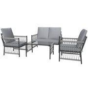 Outsunny 4 Piece Rattan Garden Furniture Set, 4 Seater Wicker Patio Conversation Set with 2 Armchairs, Loveseat, Glass Top Coffee Table and Cushions for Outdoor, Balcony, Grey - Grey