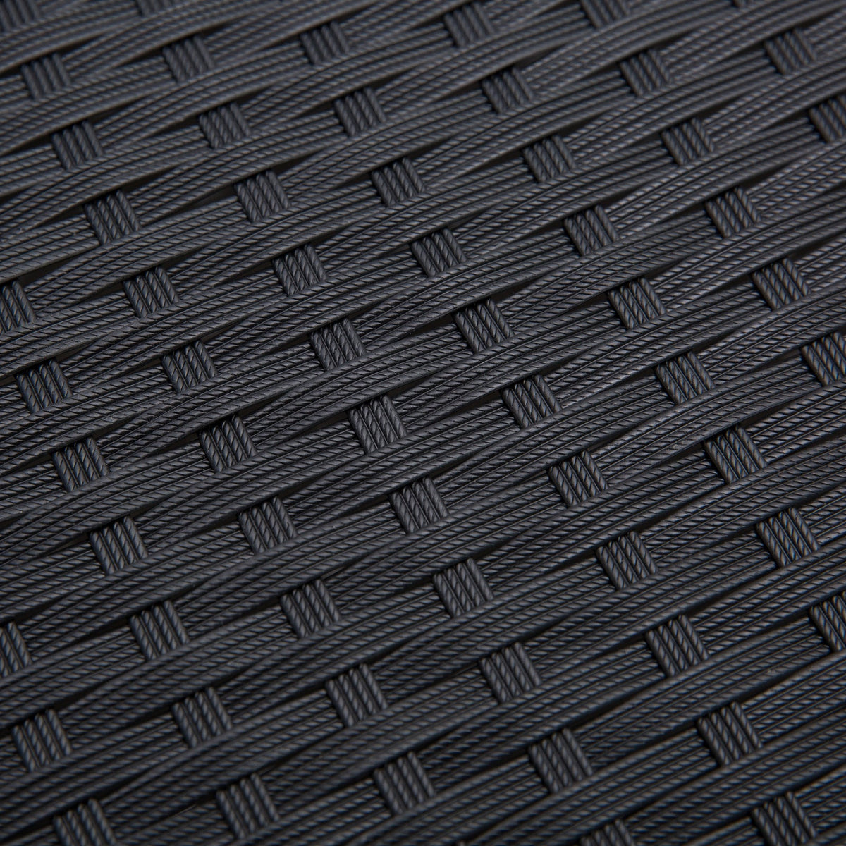 - includes two wide chairs, a two-seat sofa and large coffee table • Matte black metal frame with PE rattan panels, a muted and stripped back look