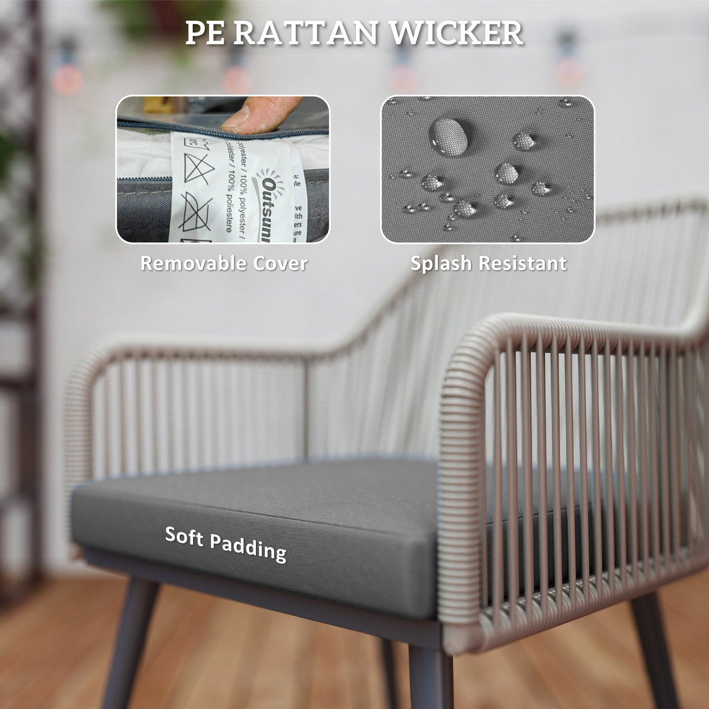 A simple yet reliable way to bring everyone together, this season and beyond with this Outsunny rattan garden table and chairs set. It comes with four chairs and a matching table, with the frames of all pieces made of steel for strength, wrapped in stylish and protective plastic rattan. The twisted rattan back and curved armrests support your body, with padded cushions for comfort. The outdoor dining set is complete with a glass-top table, with 4.2cm middle hole to hold a parasol in place.