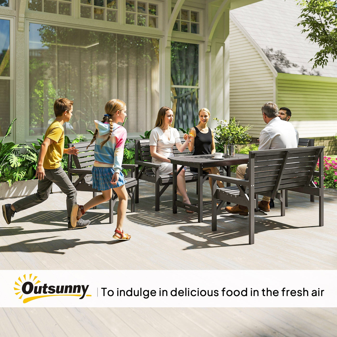 Offer enough sitting space for family and friends with Outsunny. Our outdoor garden furniture offers six seats with a wood slat style. Included are an outdoor dining table, two chairs and two love seats. Sit down to dinner, share drinks or play a board game. You can enjoy time out in the shade when you make use of the centre slot for an umbrella. The surface of each piece features a waterproof varnish, allowing the slats to let rain slide right off. Get out, get comfy, get Outsunny.