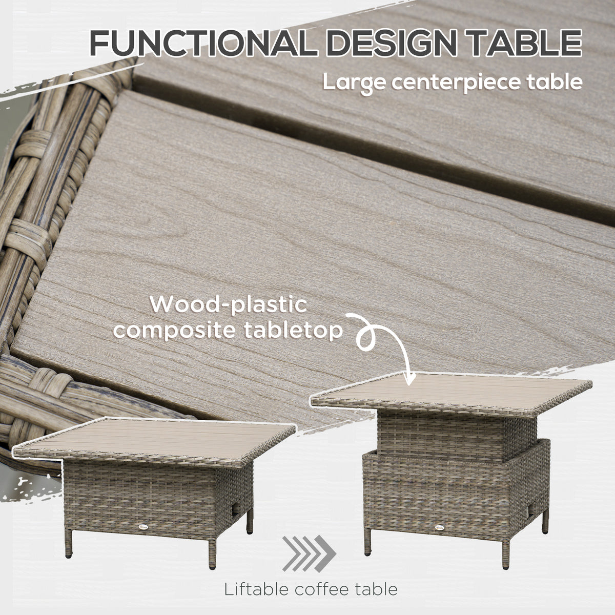Relax together in comfort and style in this Outsunny rattan corner sofa set., Six pieces: corner chair, right-handed loveseat, left-handed loveseat, long footstool, square footstool and a liftable coffee table - arrange in a way you want. Metal frame for a strong core, wrapped in plastic rattan for support, durability and style. The table can be raised or lowered-dine at a level you want; comes with a wood-effect top for extra beauty.