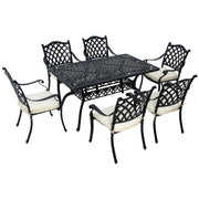 The garden table and chairs set includes six chairs and matching table with an umbrella hole - you've got everything you need to dine and relax with family and friends. Cast aluminium structure makes all pieces strong and sturdy, suitable for plenty of outdoor use. The seats come with cushions for comfort; their curved backs and arms offer body support. Place your parasol in the middle table hole to keep protected from glaring sunlight.