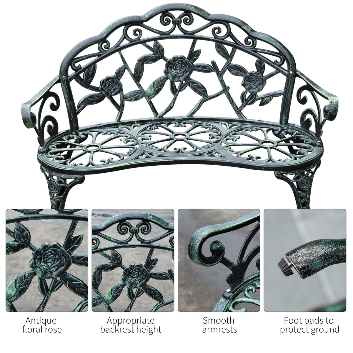 This antique style cast aluminum bench is a great addition to any garden. Made with the latest casting methods of aluminum, and finished with an antique green colour. It has a great rose pattern and a curved front to give added style and comfort. An added feature to any garden which can last for years.