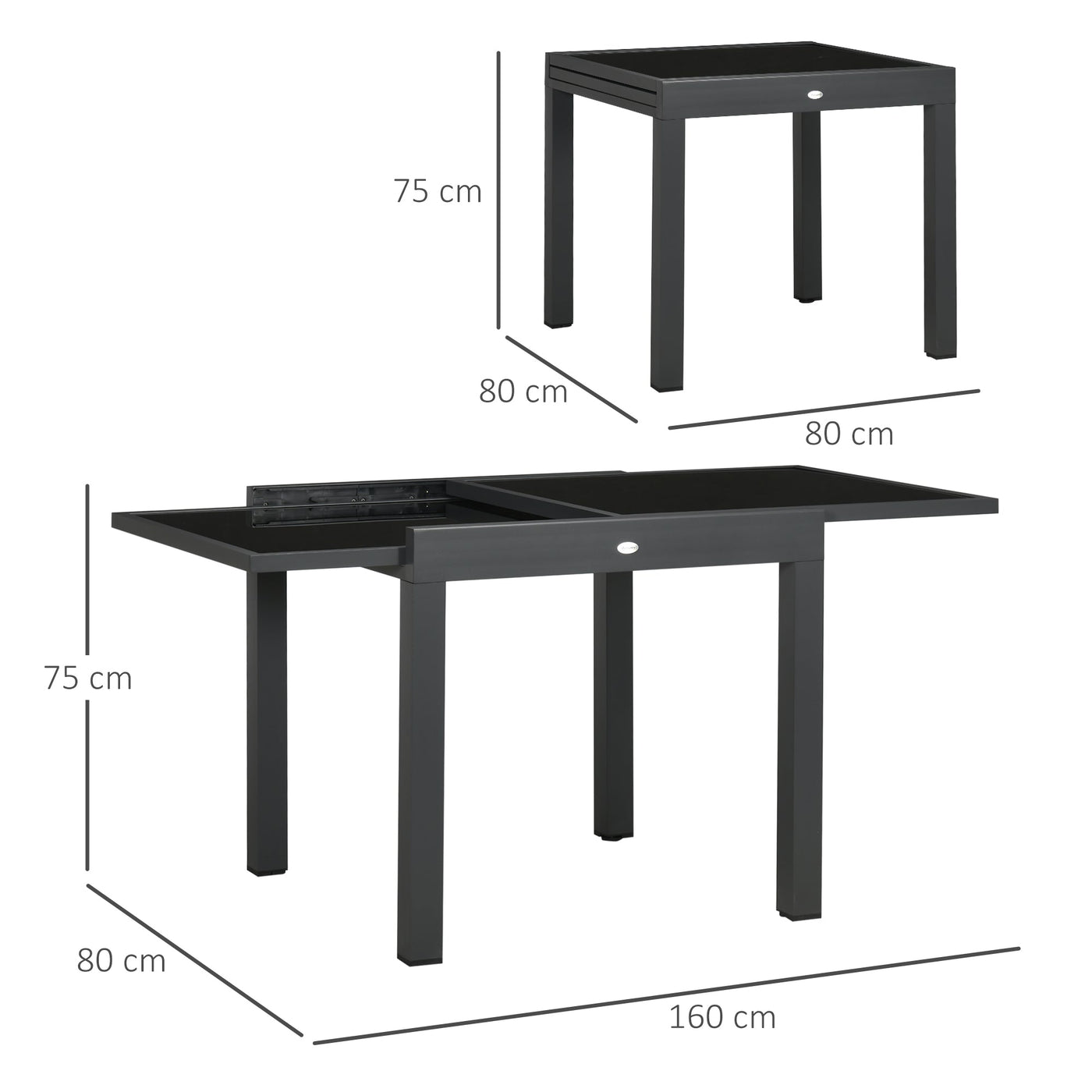 Outsunny Extending Garden Table, Outdoor Dining Table with Aluminium Frame and Tempered Glass Tabletop, 80/160 x 80 x 75 cm, Black - Black