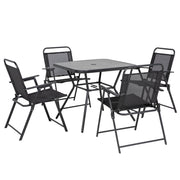 Relax with company, with this Outsunny five-piece dining set. Powder coated metal frames mean strong structures. 4.2cm central hole in table to hold parasol - keep shaded as you're all seated. Set includes: Four foldable armchairs and a matching square dining table.