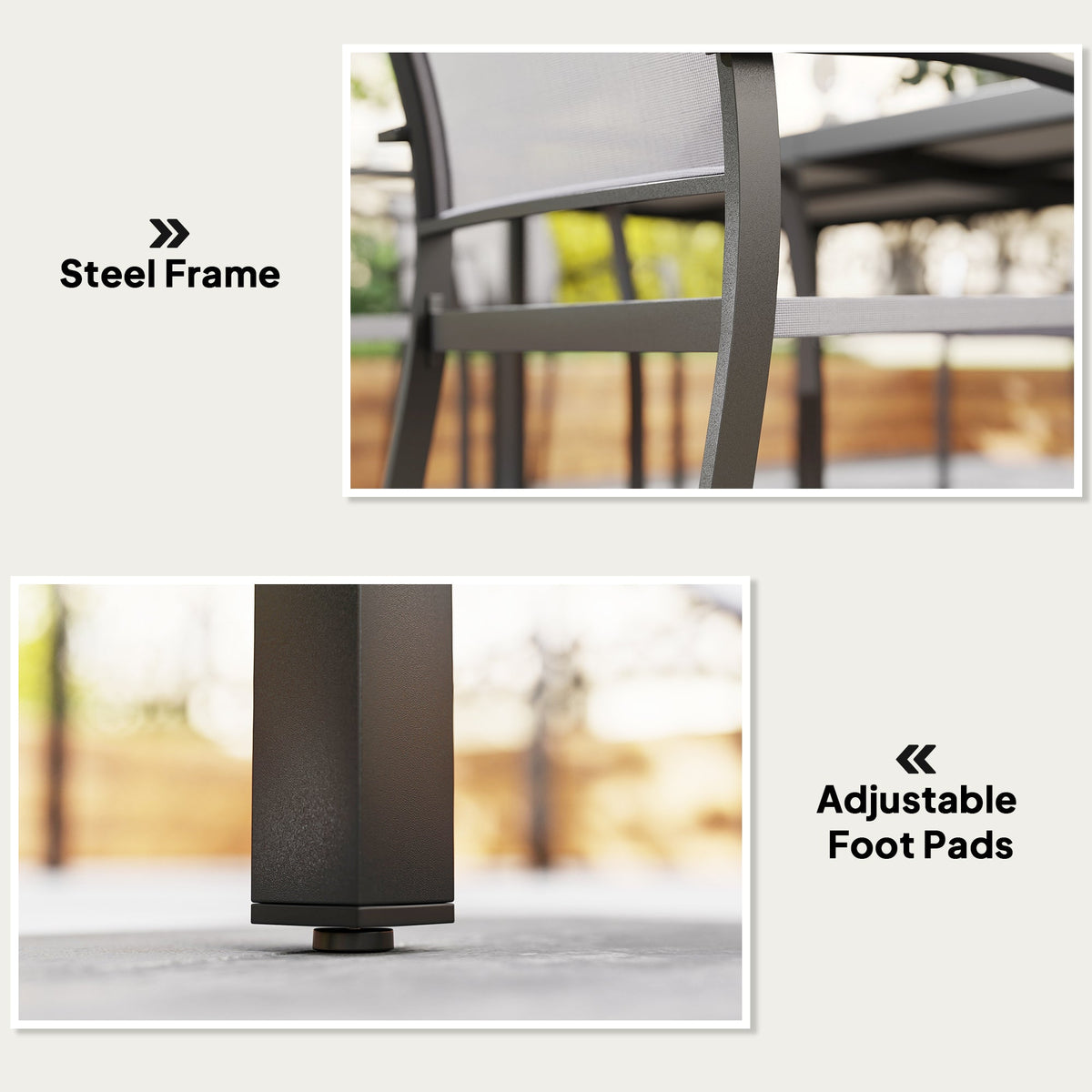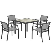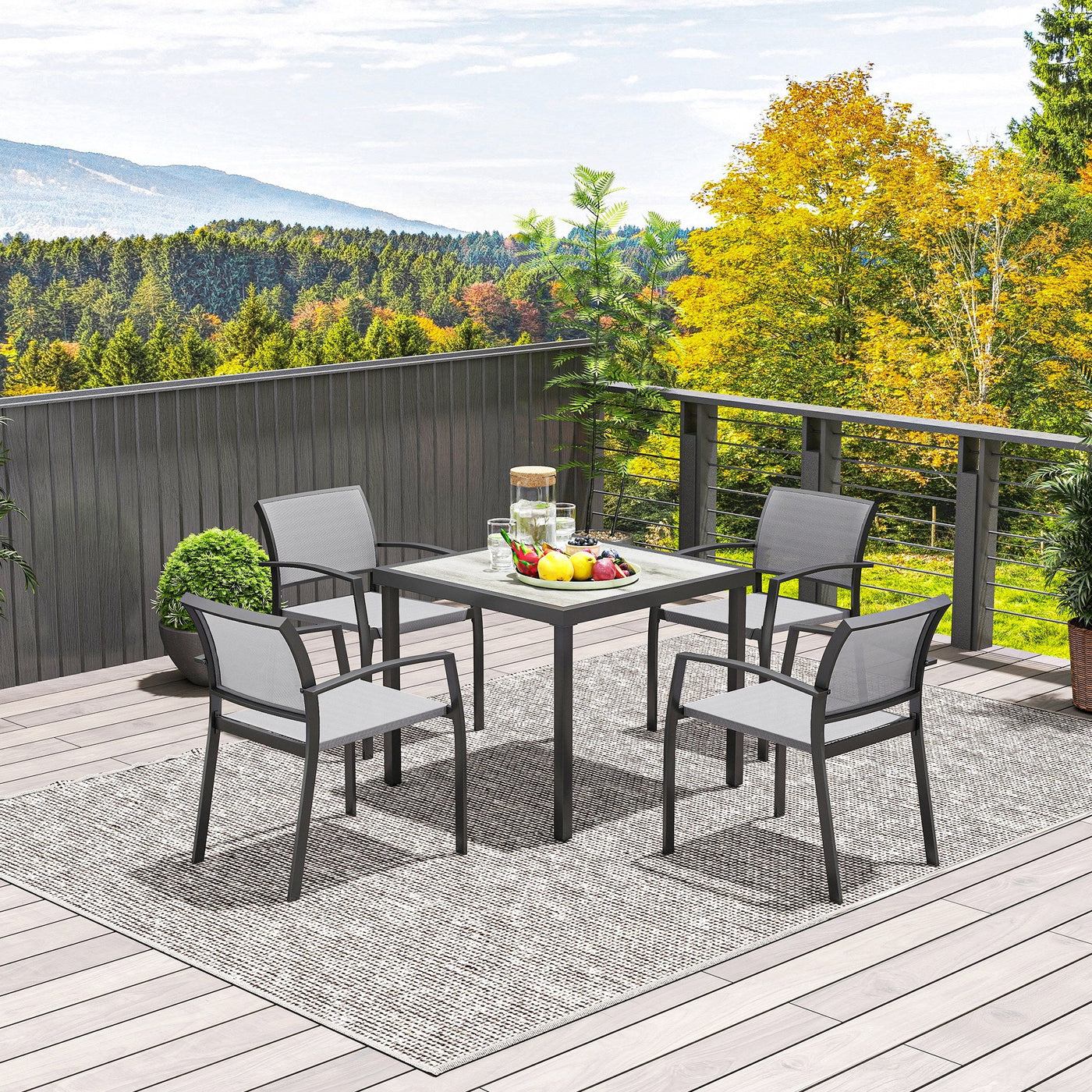 This Outsunny five-piece outdoor dining set allows you to dine and relax with loved ones. Comes with four stackable chairs with texteline fabric to sit company - the high backs and armrests support your body. The tall square table offers a comfortable surface to dine from, complete with beautiful wood-effect panels.