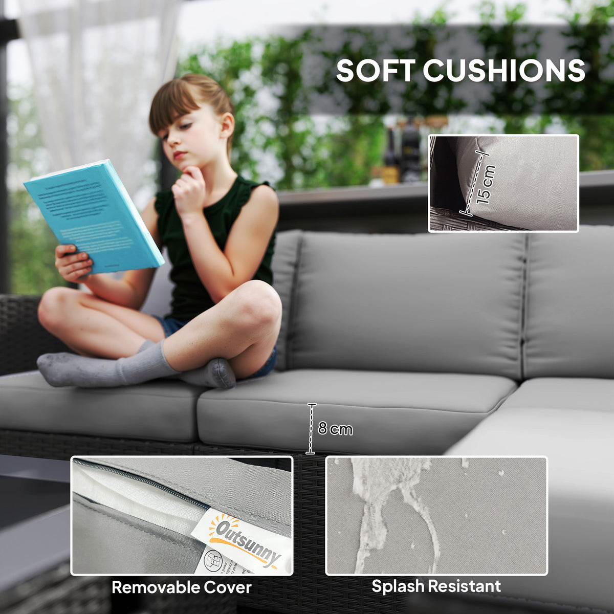 Transform your garden into a cosy haven through the corner garden furniture with fire pit table from Outsunny. This modular outdoor sofa set includes two corner chairs, a middle chair, a footstool and a square table, crafted from all-weather three-strand PE rattan on a robust steel frame. The highlight? A gas fire pit table doubles as a coffee table, ensuring warmth and style in your outdoors. Whether hosting friends or enjoying a quiet moment, the Outsunny rattan sofa set enhances your space.