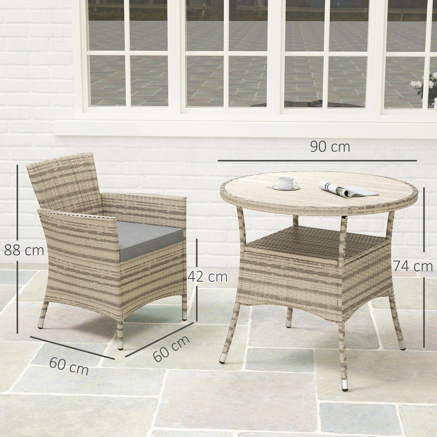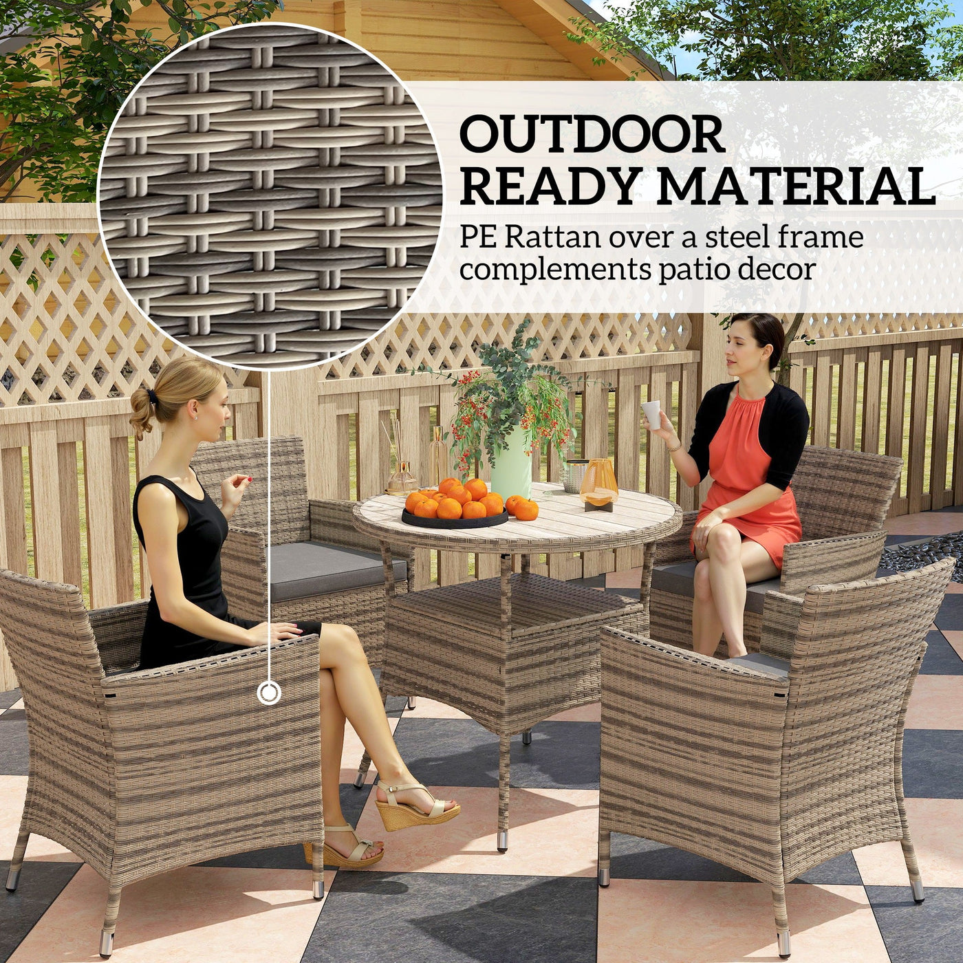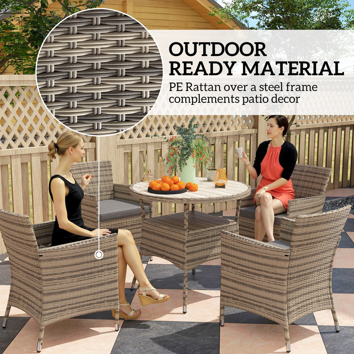 Relaxing outdoor times with company: look to this Outsunny rattan outdoor table and chairs. It's formed of four chairs and a round table - gather round with company. The two-tier table provides double holding room, right next to you; the wood-effect tabletop looks great. Steel frames for a strong core, wrapped in stylish and robust plastic wicker. Complete with padded seat cushions to sit in comfort.