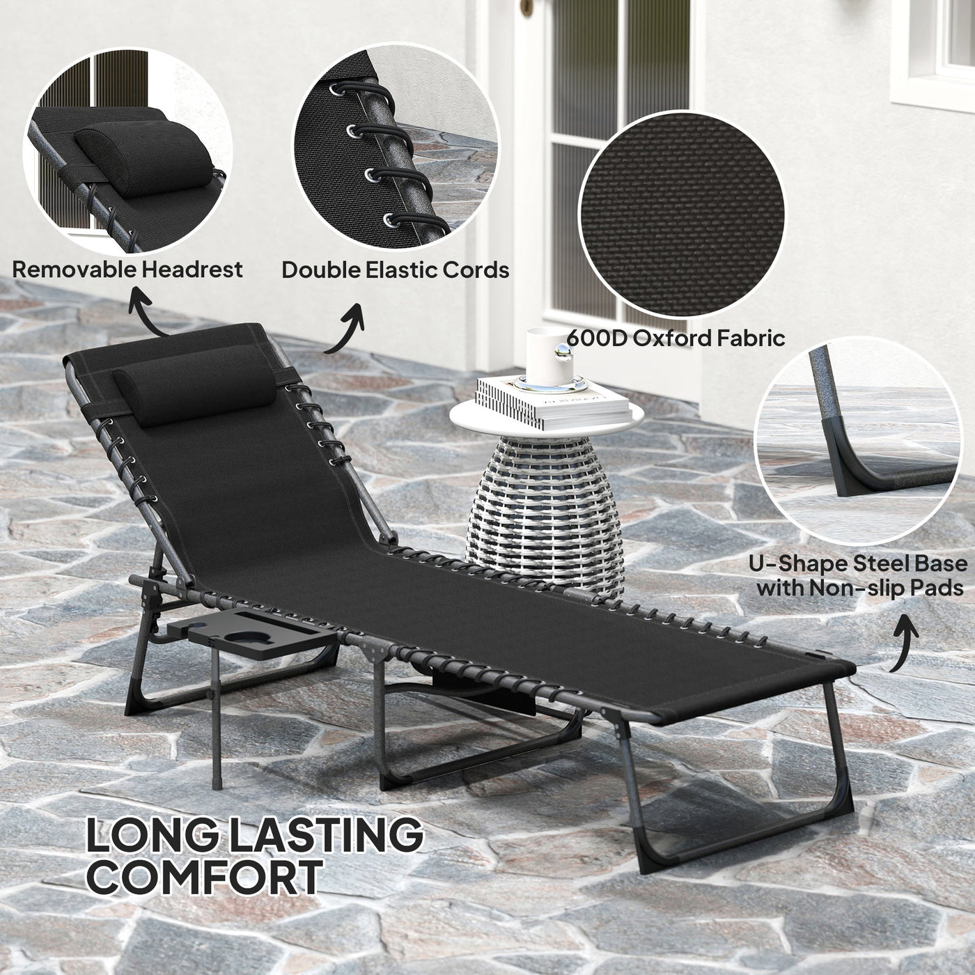Lay the day away your way, with this Outsunny sun lounger. The back sets to five different angles to a position you want. Powder coated steel frames are strong structures to support you as you relax. The fabric seat with double elastic cords holds you comfortably, with a removable pillow for the head and neck. The side table and pocket offers storage as you relax on this foldable sun lounger, complete with a handle to carry around easily.