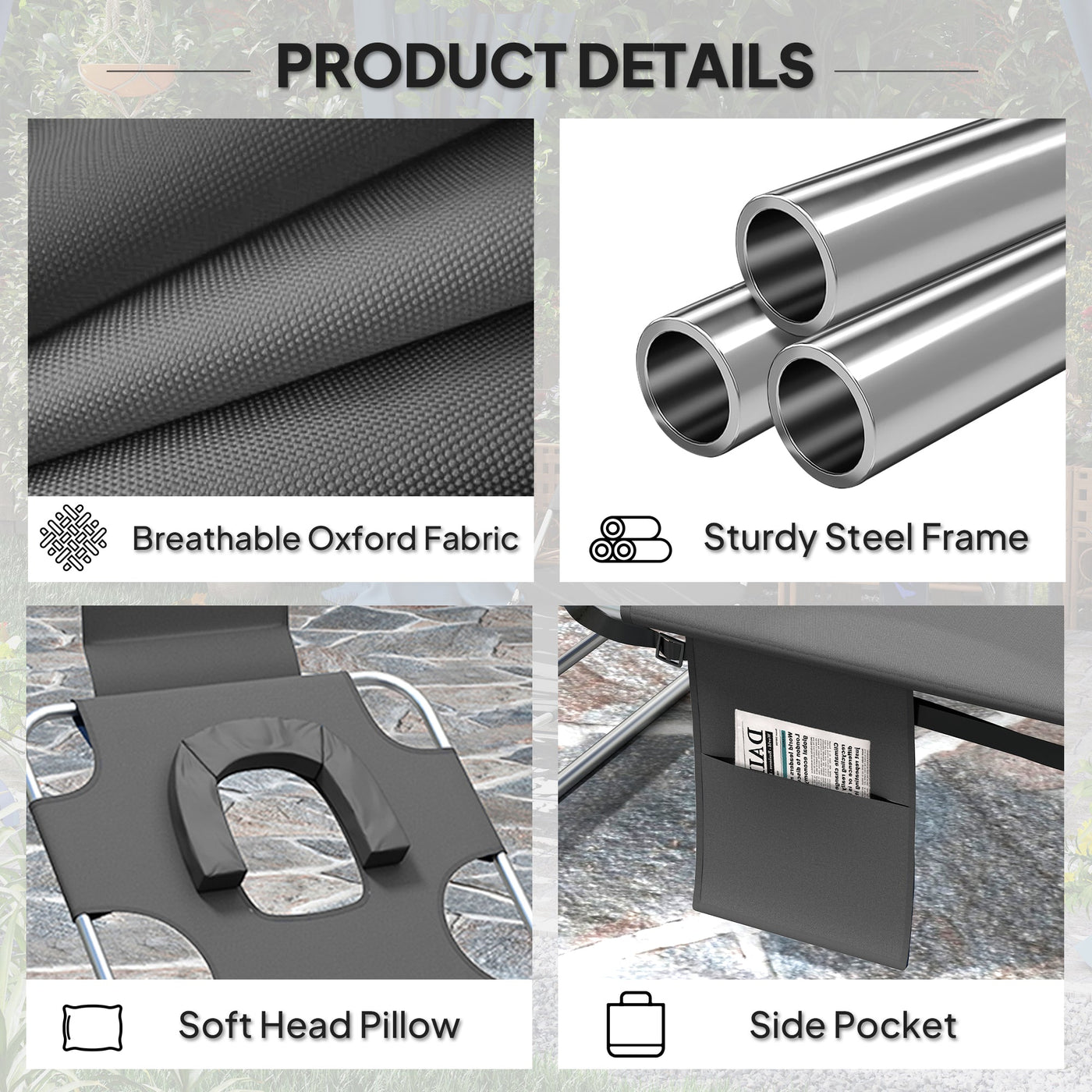 Outsunny Foldable Sun Lounger Set of 2, Beach Chaise Lounge with Reading Hole, Arm Slots, 5-Position Adjustable Backrest, Side Pocket, Pillow for Garden, Beach, Pool, Dark Grey - Dark Grey
