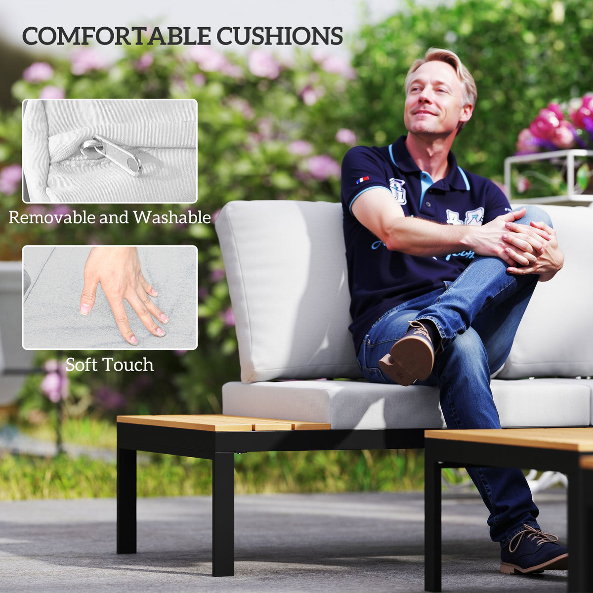Transform your garden into a haven of relaxation with the corner garden furniture set from Outsunny. This versatile balcony furniture set includes two loveseats and two coffee tables, allowing you to configure them in L-shaped or straight, combination or separation for different outdoor gatherings. Enjoy comfort with soft, easy-clean cushions, strong support with metal frame and stylish convenience with the slatted tabletops. Great for any garden, balcony, or conservatory.