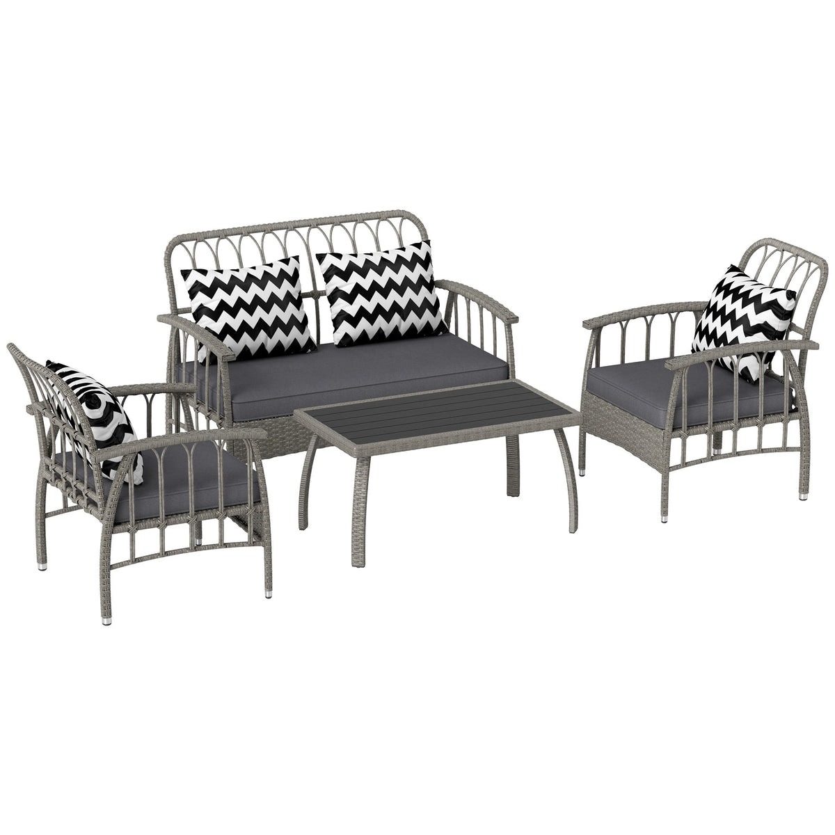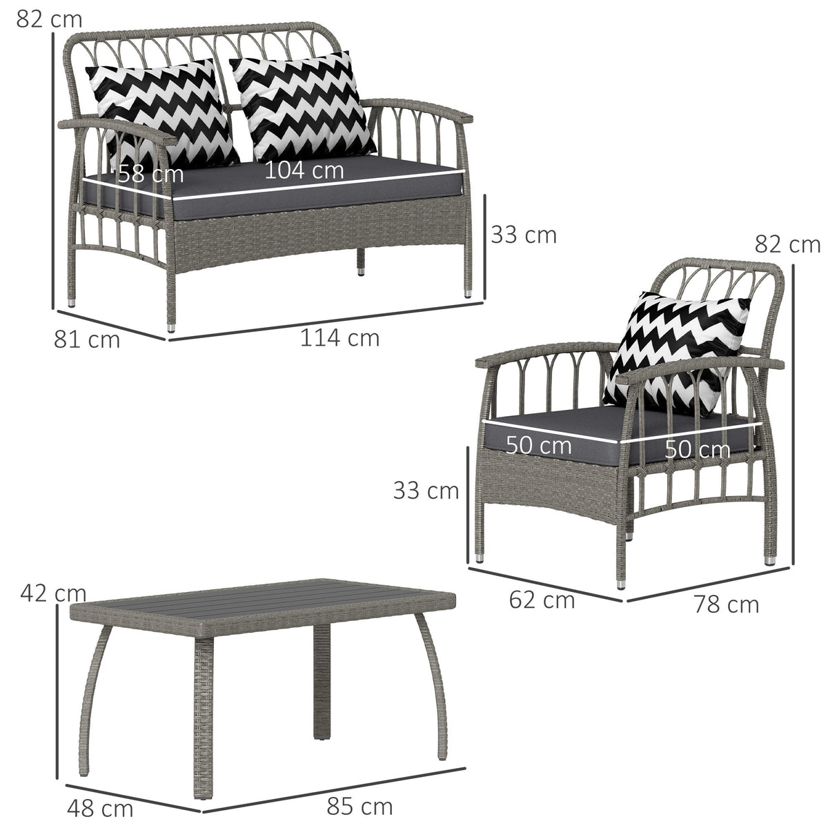 An inviting outside, all day long with this Outsunny rattan garden sofa set. Comes with a loveseat, two armchairs and a matching coffee table. Steel frames mean a strong core wrapped in protective plastic rattan in a cool cut-out design. Both chairs feature a five-level adjustable back: relax to the position you want. Conservatory furniture set complete with seat and throw cushions for plenty of comfort.