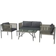 For style from morning through to evening, this Outsunny four-piece rattan furniture set is exactly what you need. It comes with two armchairs, a loveseat and a coffee table - room for up to four people. The powder coated steel frames are strong and supportive, fitted with round rattan strings for elegant garden style. Outdoor furniture set is complete with soft seat cushions and a tempered glass tabletop.