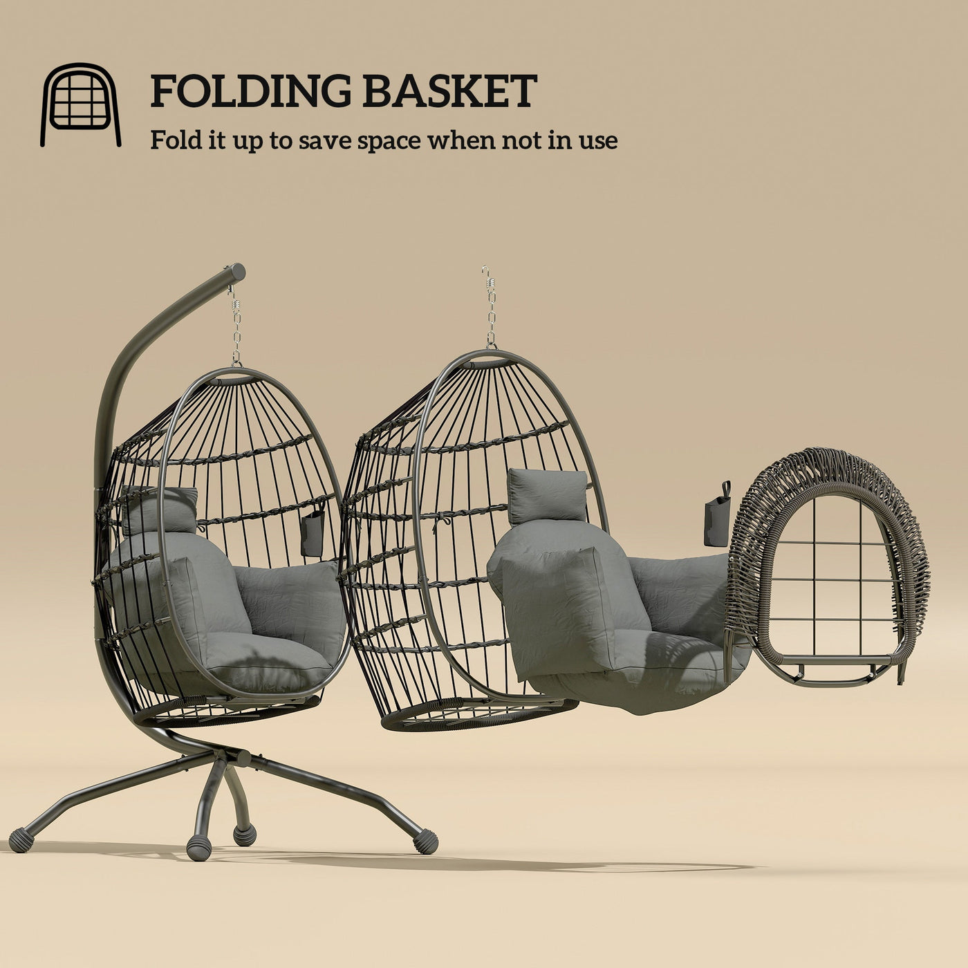 Outsunny Hanging Egg Chair Outdoor Indoor Garden Swing Chair with Folding Basket and Thickened Cushion, Garden Hanging Chair with Stand, Headrest, Cup Holder for Patio, Balcony, Dark Grey - Dark Grey
