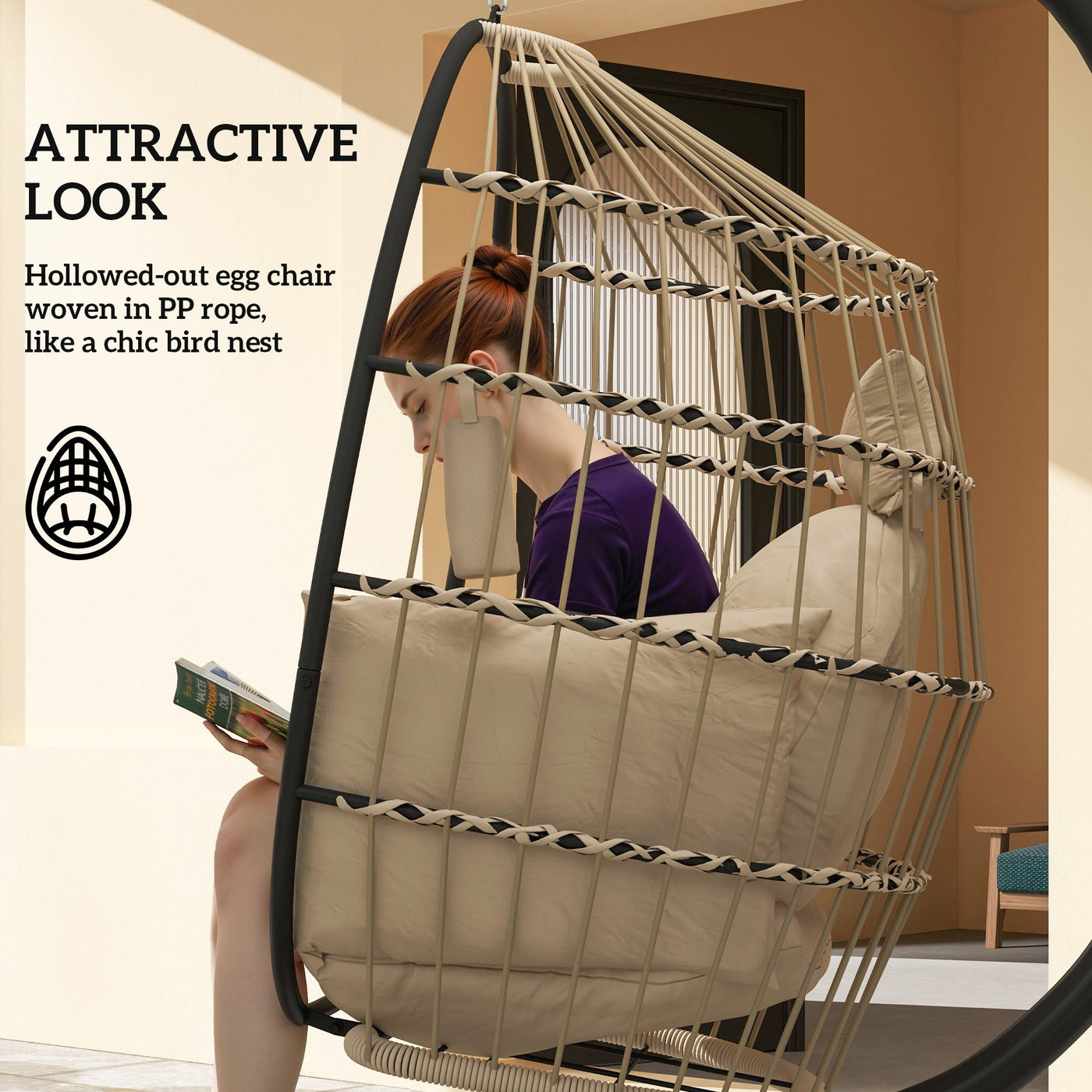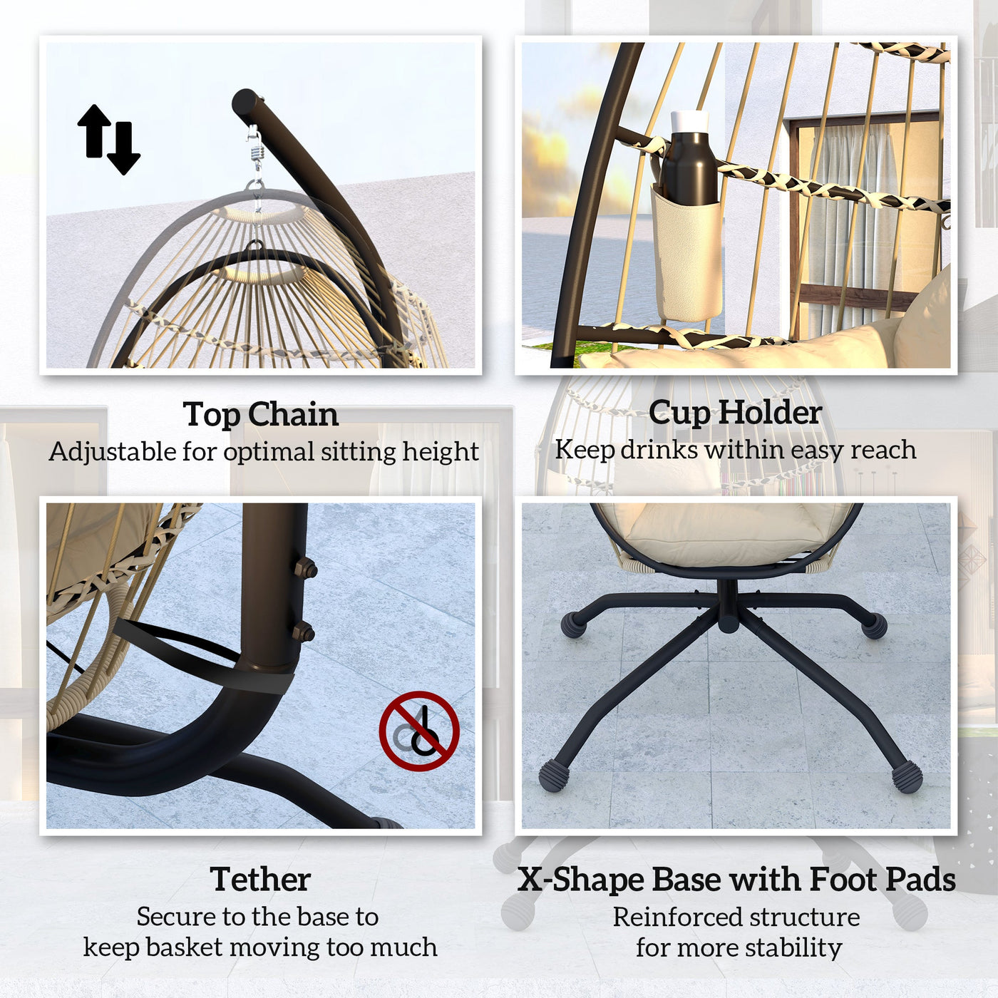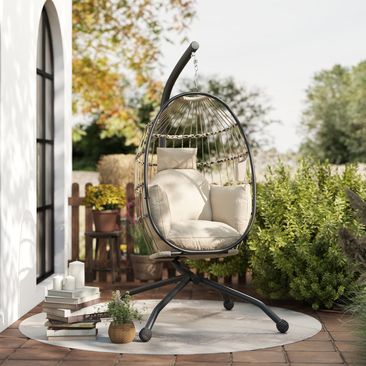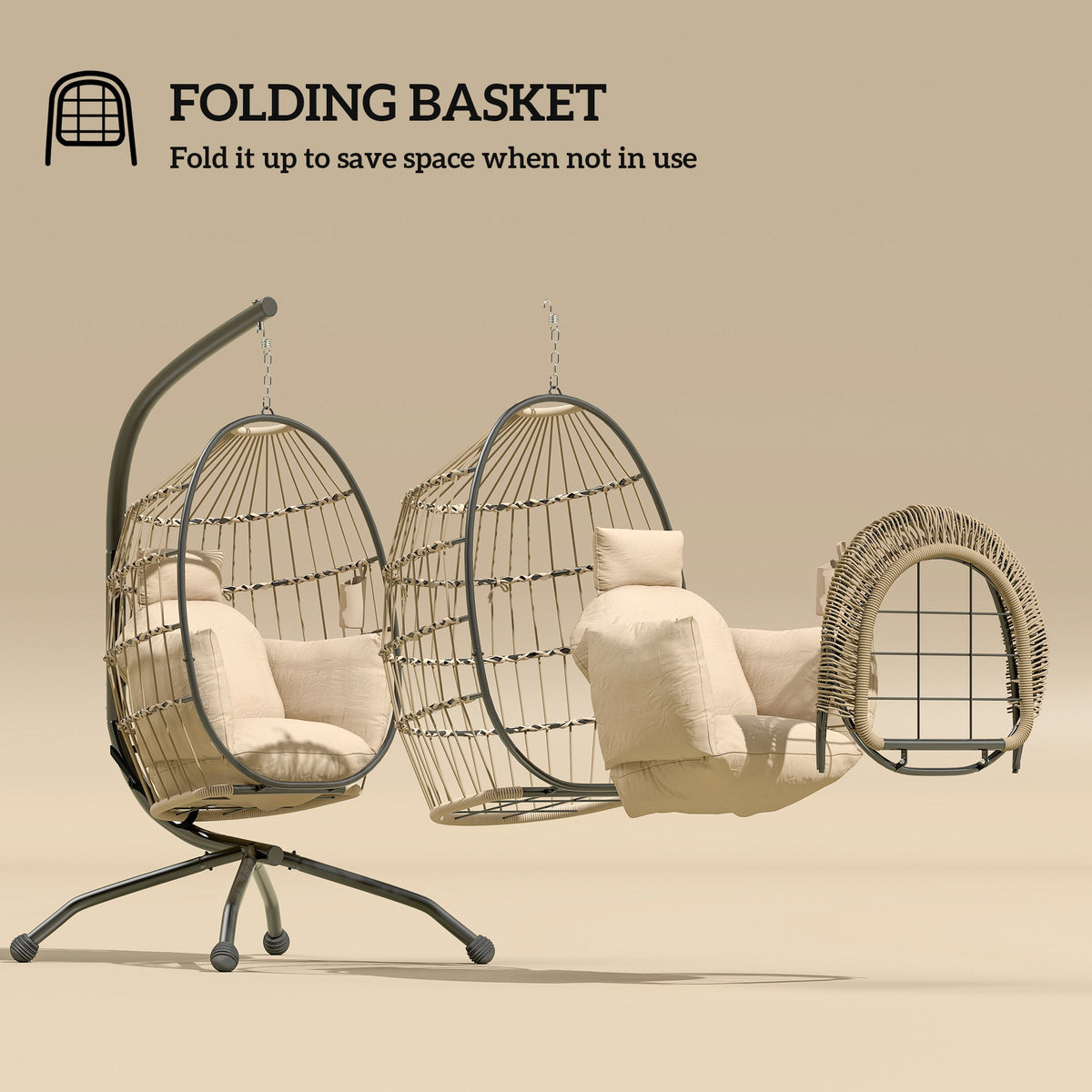 Outsunny Hanging Egg Chair Outdoor Indoor Garden Swing Chair with Folding Basket and Thickened Cushion, Garden Hanging Chair with Stand, Headrest, Cup Holder for Patio, Balcony, Khaki - Khaki