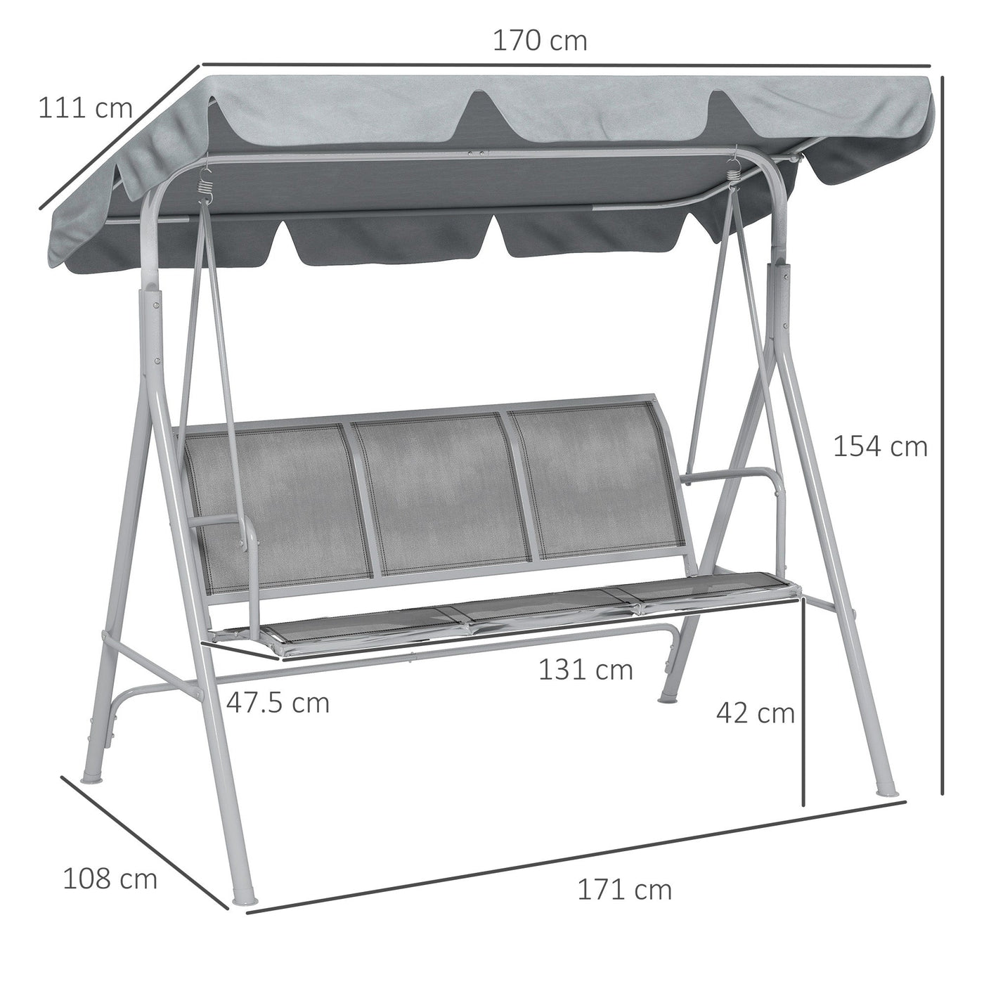 Outsunny Metal Garden Swing Chair, 3-Seater Swing Seat, Patio Hammock Bench Canopy Lounger, Light Grey - Light Grey