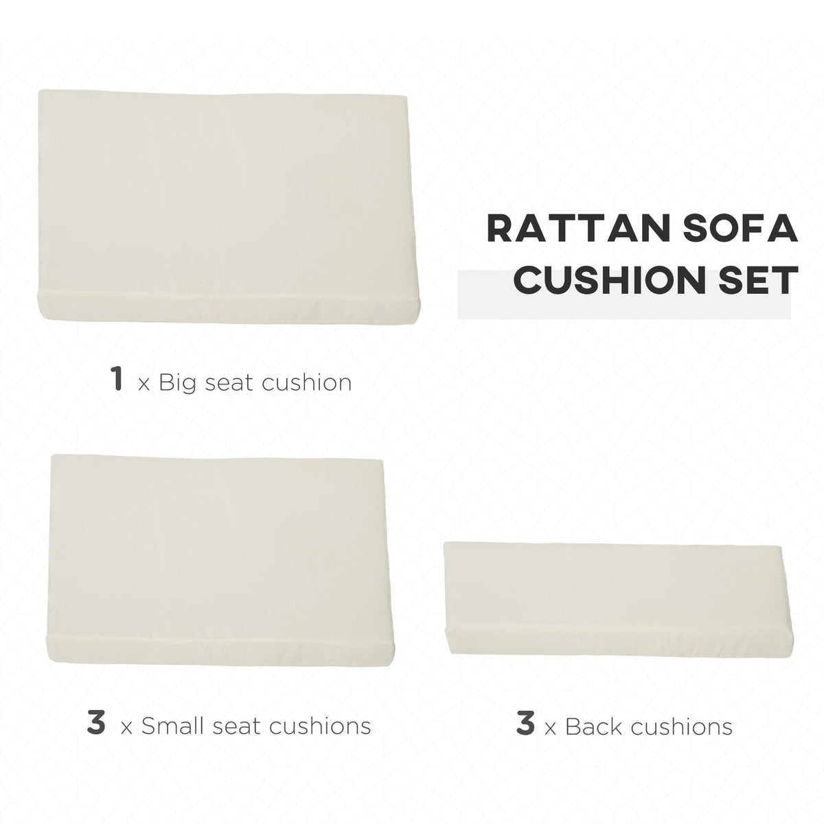 New comfort for your outdoor rattan sofa set - these cushions from Outsunny. Comes with seven pieces: three small seat cushions, one big seat cushion and three back cushions. Each cushion is filled with thick cotton for comfort. The polyester covers are breathable and fade-resistant, with a zip fastening to remove and clean easily. Comfort and style in your garden the easy way.\n