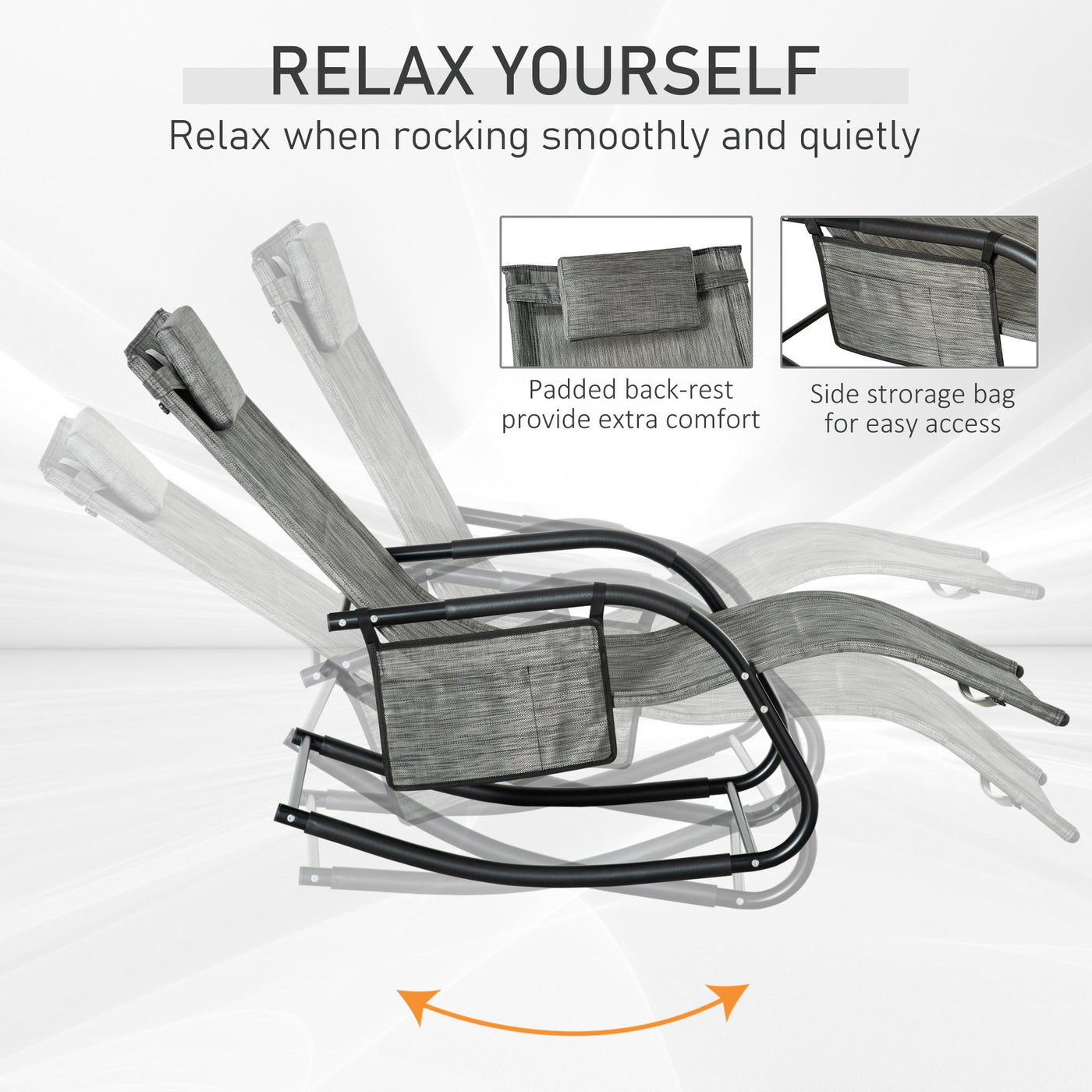 Outsunny Outdoor Garden Rocking Chair, Patio Sun Lounger Rocker Chair with Breathable Mesh Fabric, Removable Headrest Pillow, Armrest, Side Storage Bag, Dark Grey - Dark Grey
