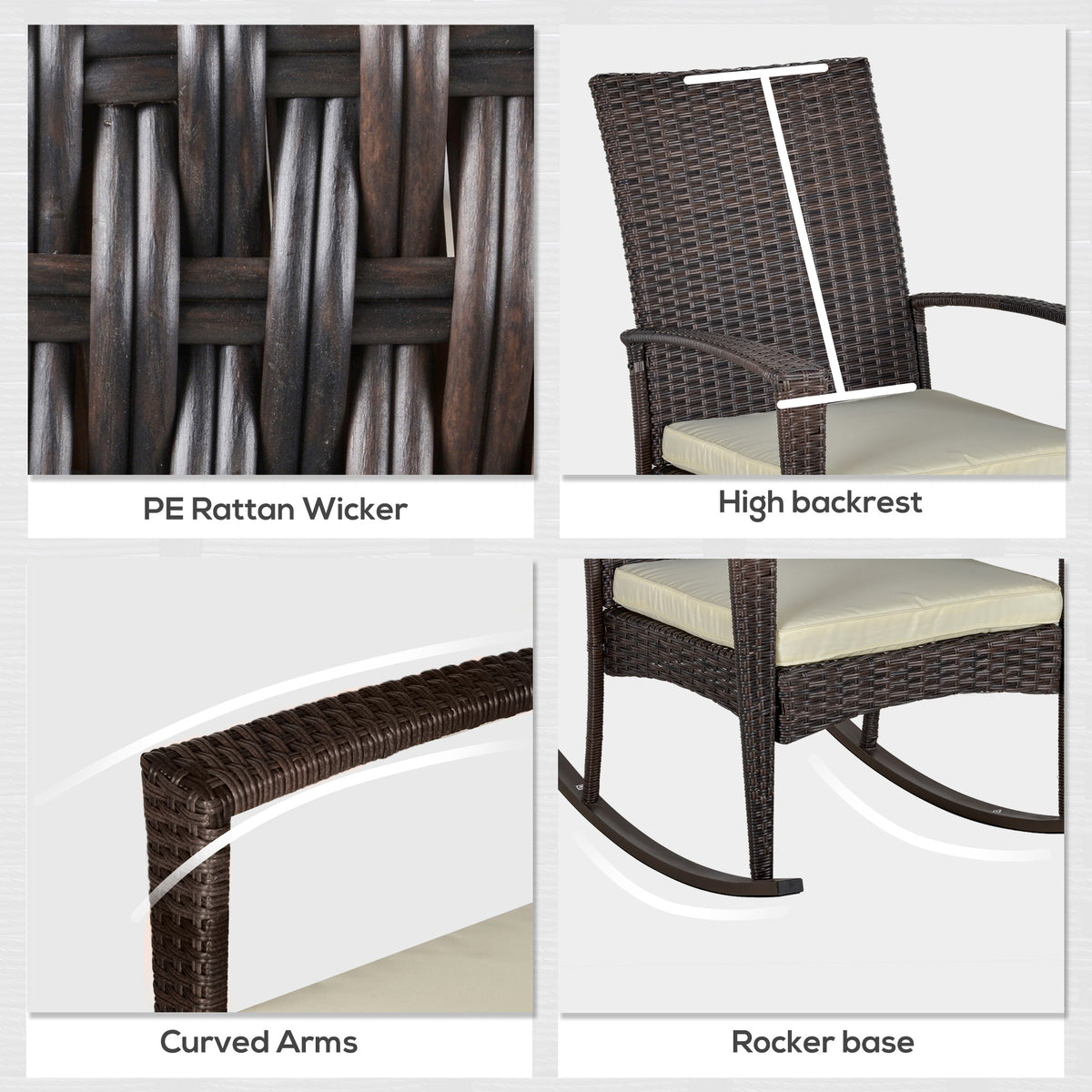 Outsunny PE Rattan Garden Rocking Chair, Outdoor Rocking with Cushion, 160 KG Capacity Wicker Garden Armchair Rocker with Metal Frame for Patio, Porch, Balcony, Brown - Brown